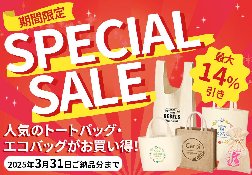 企業の販促品から個人向けの記念品まで、幅広いシーンで活躍するトートバッグや巾着・ポーチをお得に手に入れるチャンス!ぜひこの機会にご覧ください。