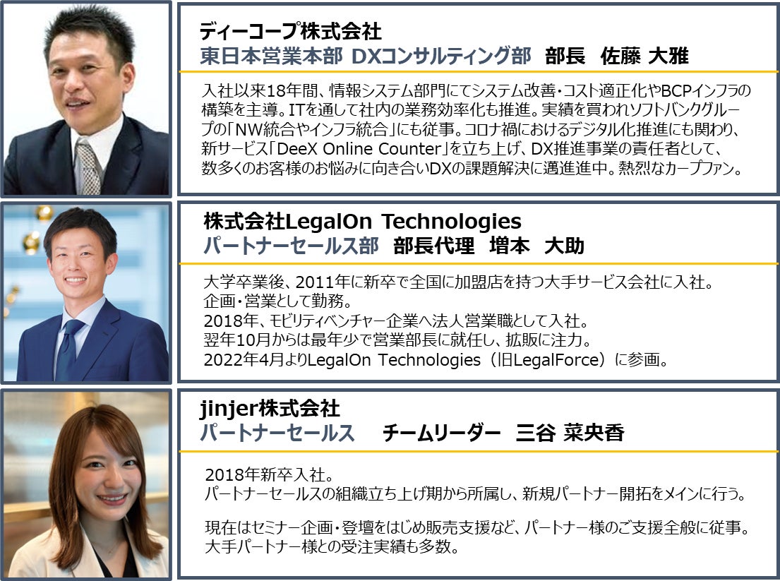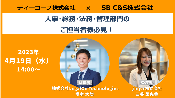株式会社LegalOn Technologies、jinjer株式会社、SB C&S株式会社、ディーコープ株式会社(本社:東京都中央区、代表取締役社長:萬田吉寛、以下ディーコープ)の4社は、2023年4月19日に共催でオンラインセミナー「抜け出しましょう ! 1人 人事・法務担当のあなたへ ~人事・法務系クラウドサービス~」を開催することとなりました。