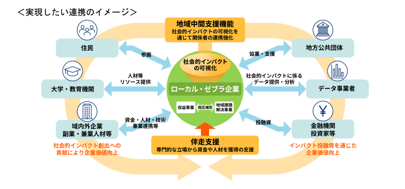 ① ローカル・ゼブラ企業の育成・支援を推進するため、ローカル・ゼブラ企業と域内外企業等が連携して、社会的インパクトを活用しながら地域課題解決事業に取り組む先行事例を創出すること。