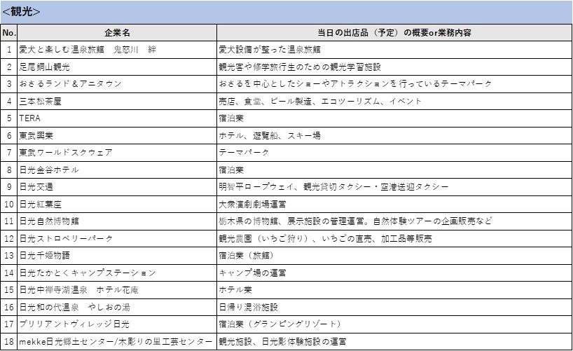 昨年度に初めて開催し、大変ご好評いただいた首都圏等をターゲットとする東京都内での商談会を本年度も開催いたします。日光の美味しい水や食材を活かした自慢の商品を提供する食関連事業者と、日光の自然・伝統文化を活かした体験・体感型の新たな観光素材の提供事業者がそれぞれ20社程度、出展する予定です。