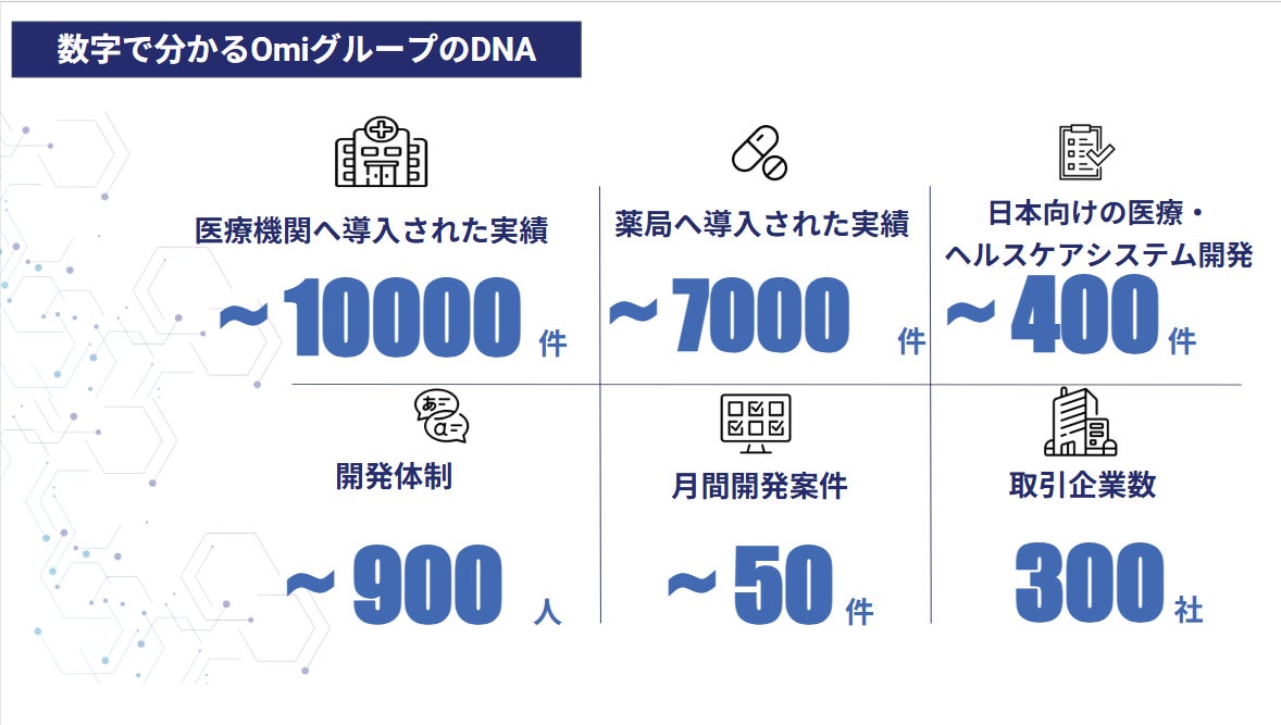 Omi Japan株式会社は日本向けの医療・ヘルスケアシステム開発に特化したオフショア企業です。14年以上の豊富な経験を有し、これまでに400以上のシステムを開発、病院・薬局など累計1万以上の医療機関に導入実績を有しています。開発実績は医療機関の内部で使用するシステム・患者向けシステムのほか、臨床試験・検査、福祉分野にまで多岐に渡ります。