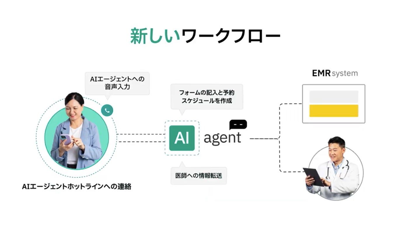 このAIエージェントは、患者との対話を通じて情報を収集・分析し、最適な診察スケジュールを提案。取得情報をEMR(電子カルテ)に自動登録する機能を備えています。