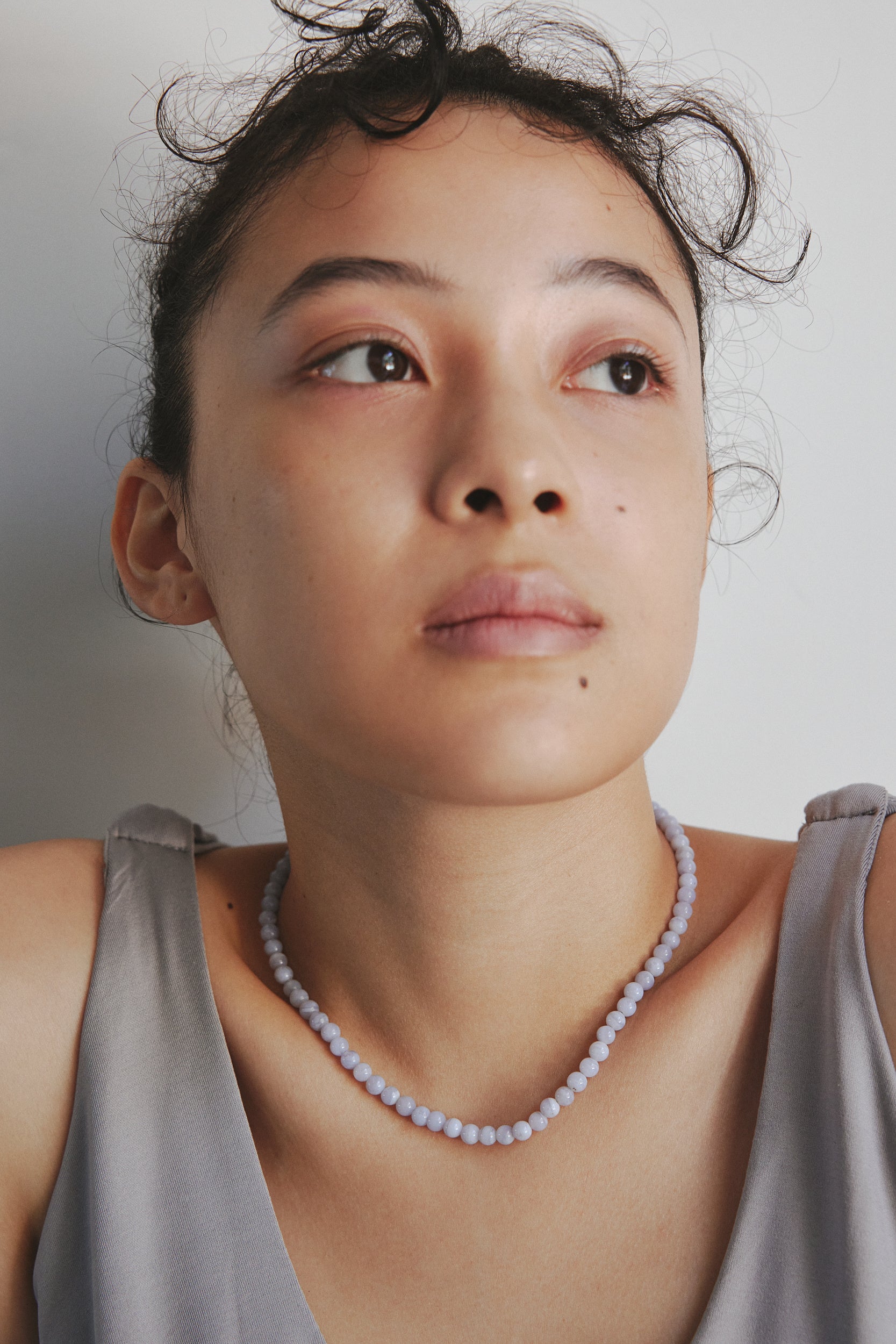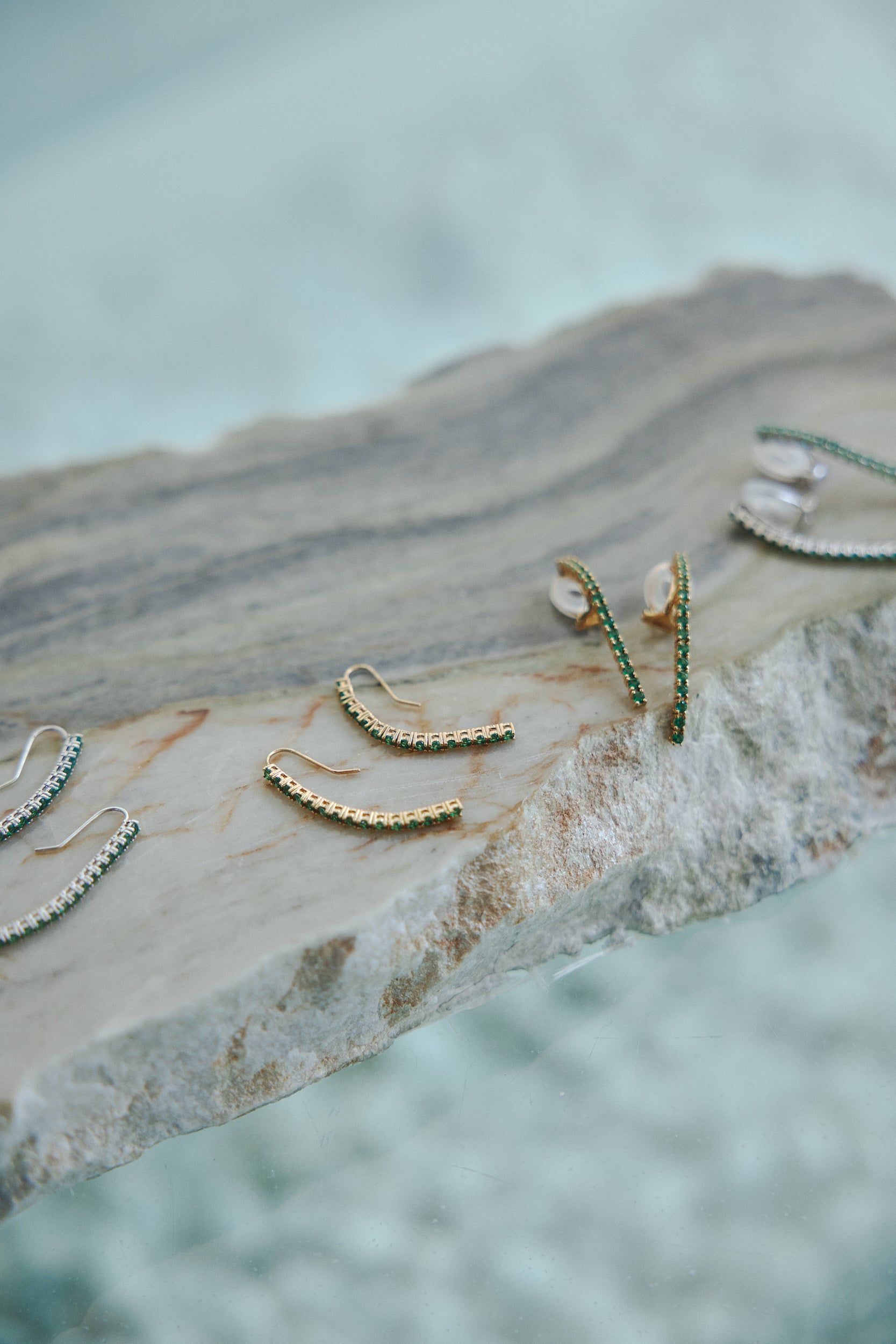 「Ever (piarcing)」は素材にシルバー925を使用し、18Kゴールドプレーティングで仕上げています。職人がひとつひとつストーンを枠にはめ込み、目の詰まった作りになっています。横や後ろから見ても金属の網目が美しく、湖の水面が揺れるようにグリーンのストーンが連なり神秘的な存在感を放ちます。また、肌馴染みの良いブルーレースストーンの「Serene (necklace)」は静かな波のような穏やかな水色が魅力的なヒーリング効果のあるネックレスです。