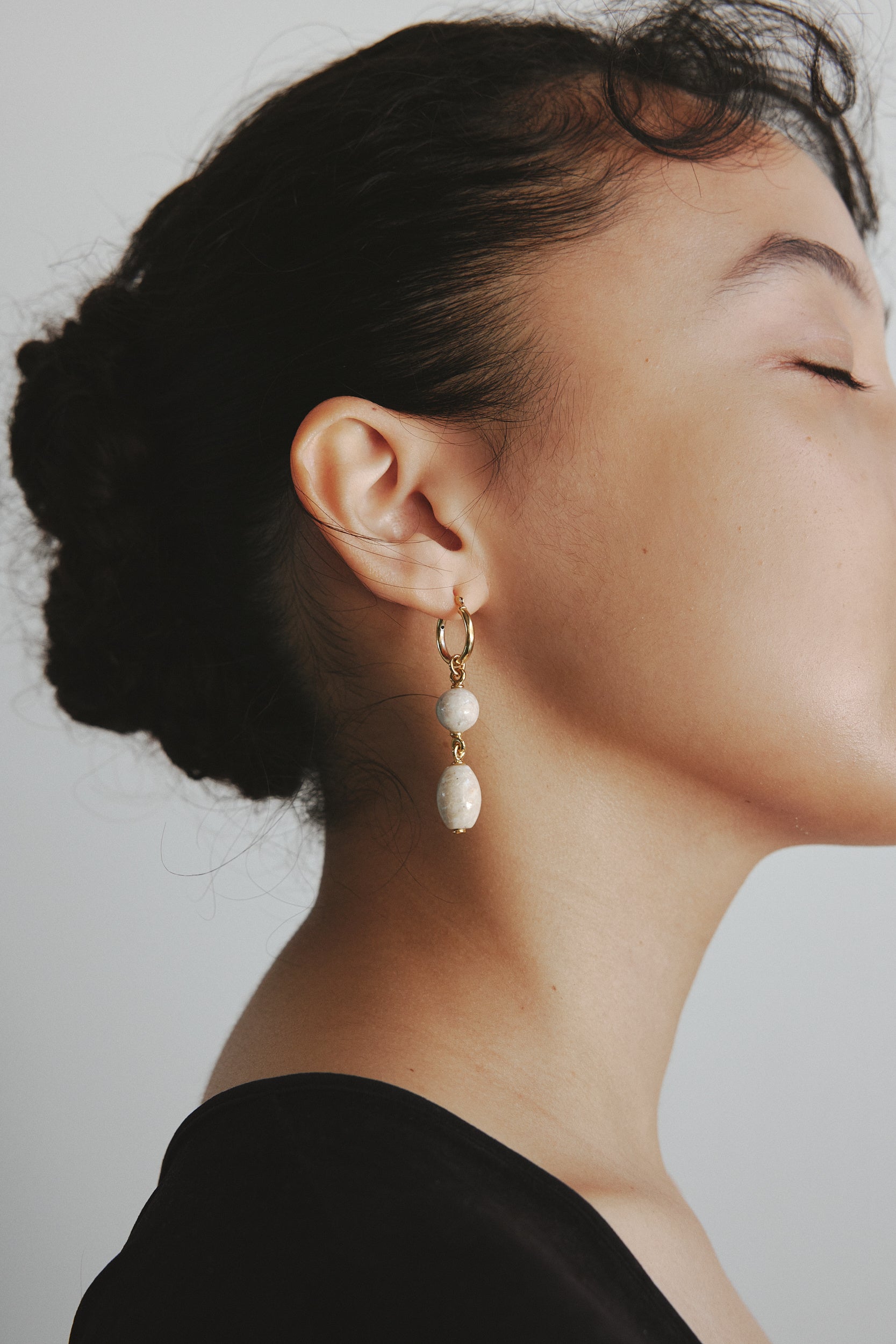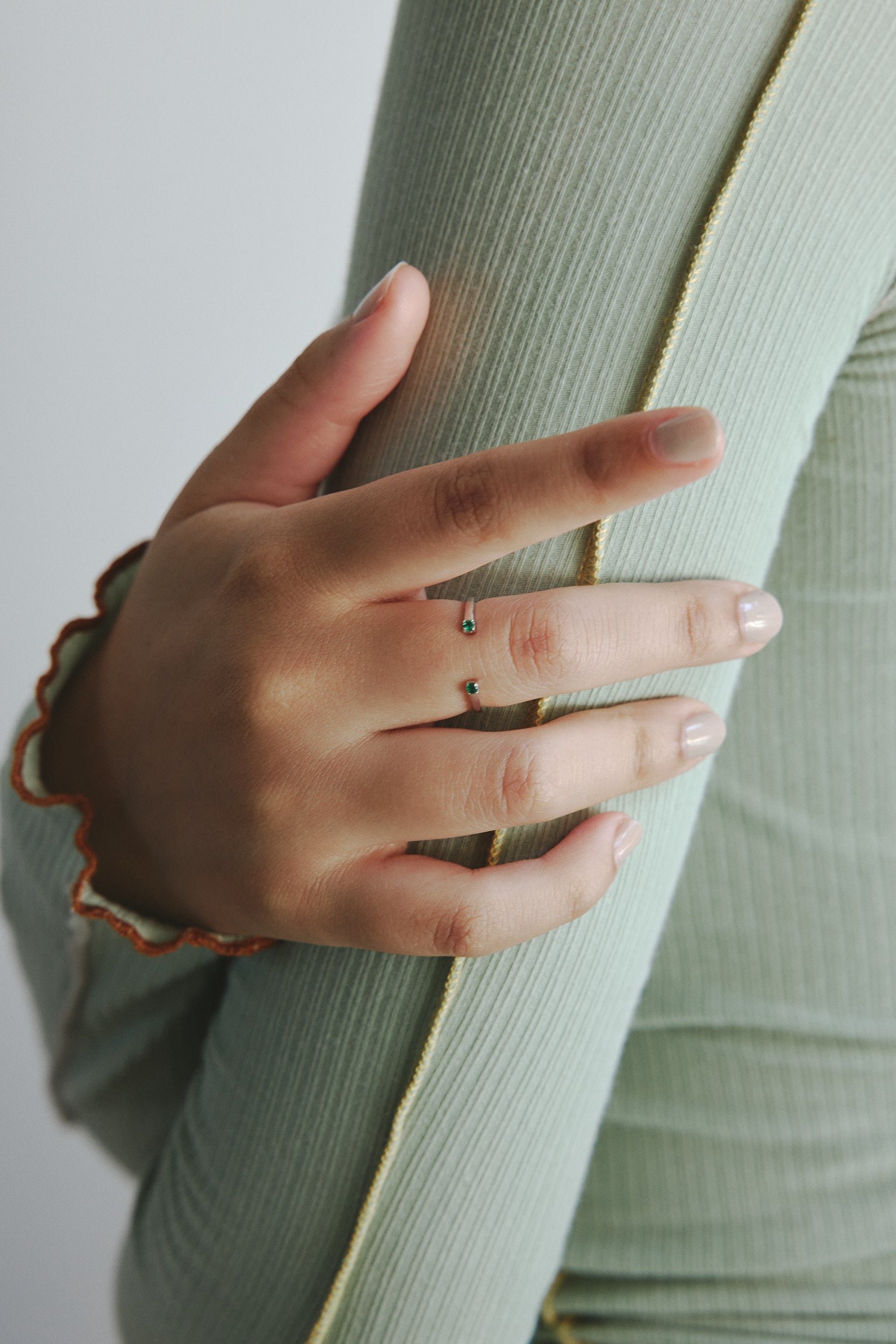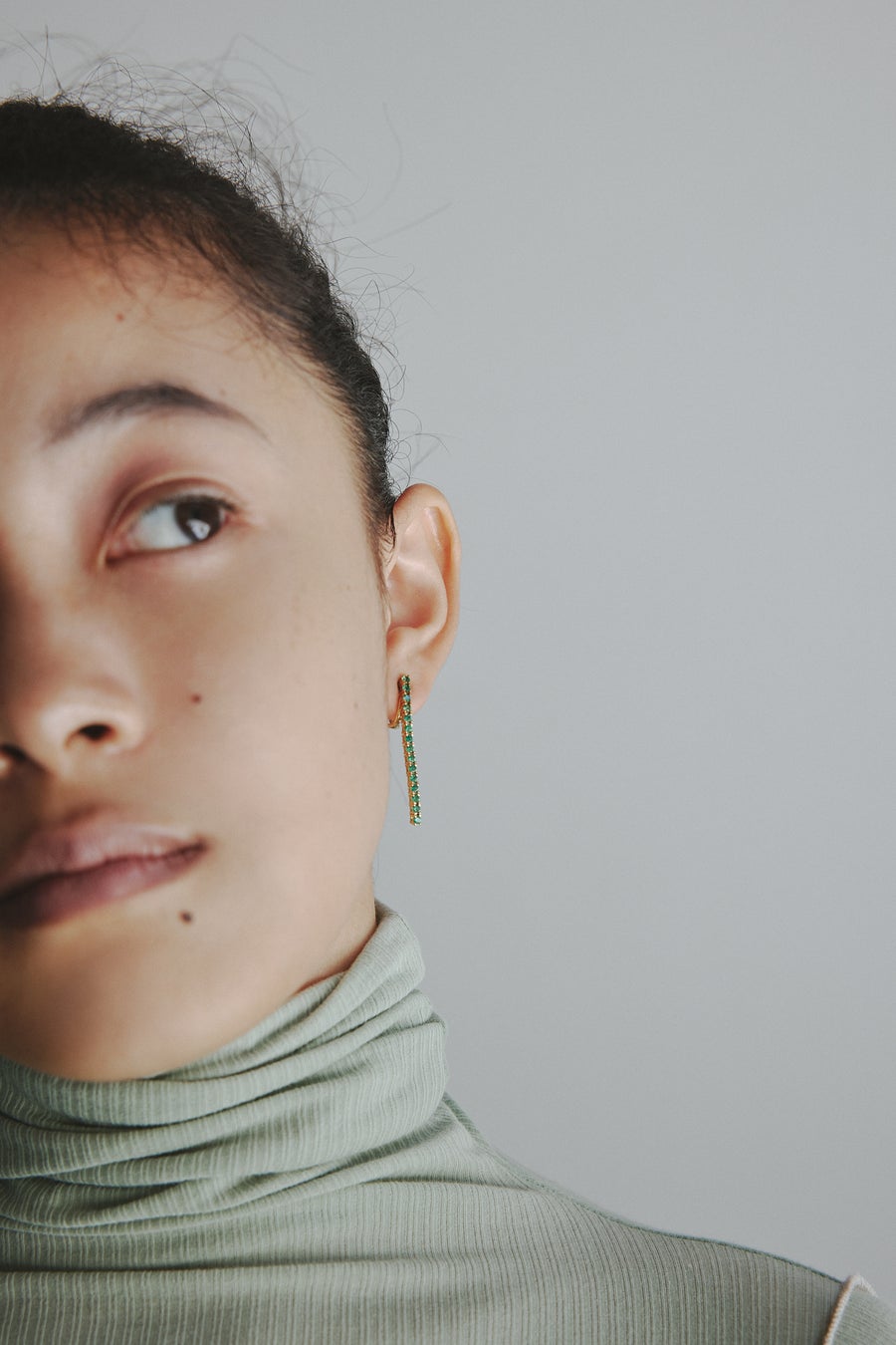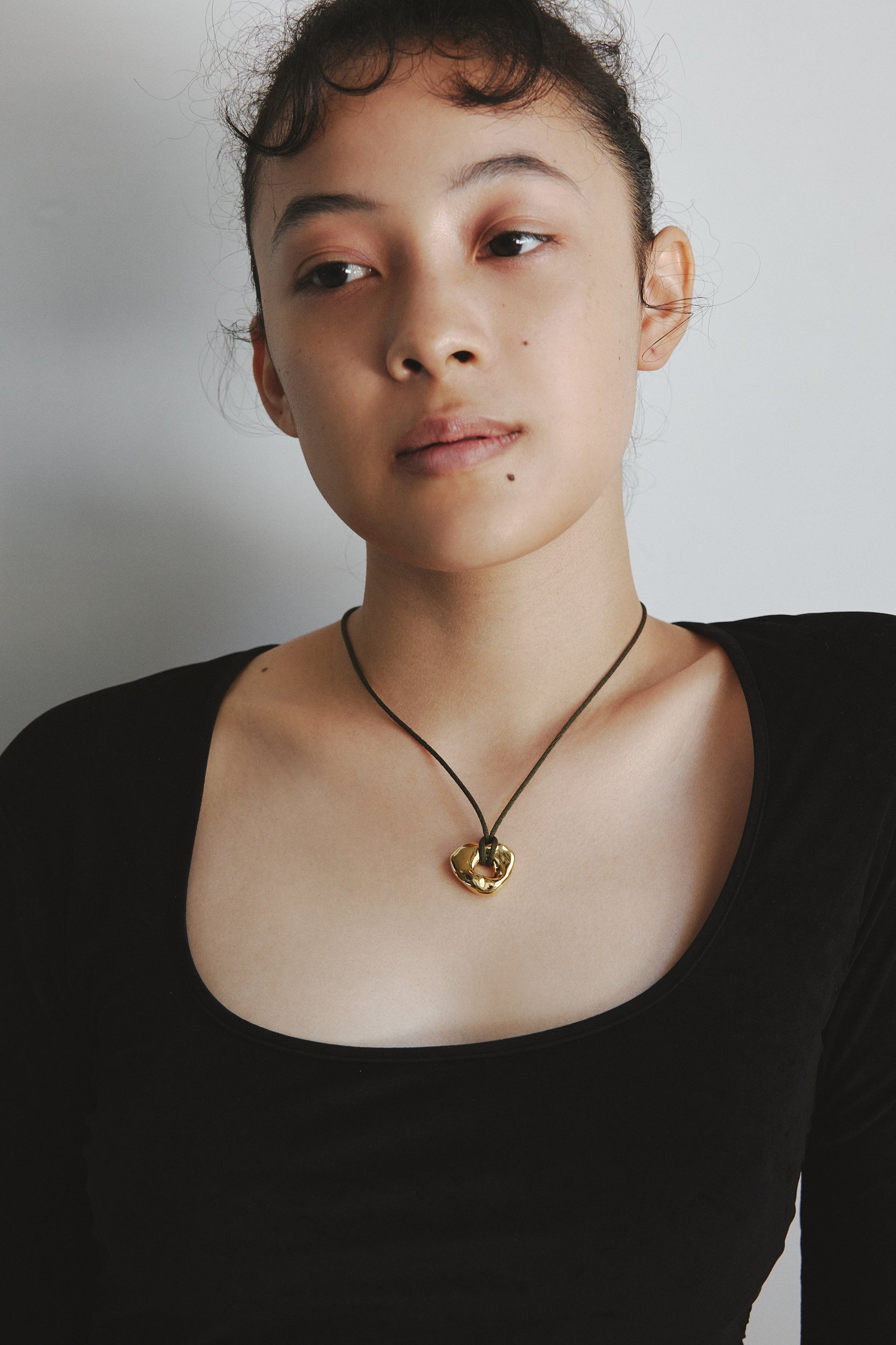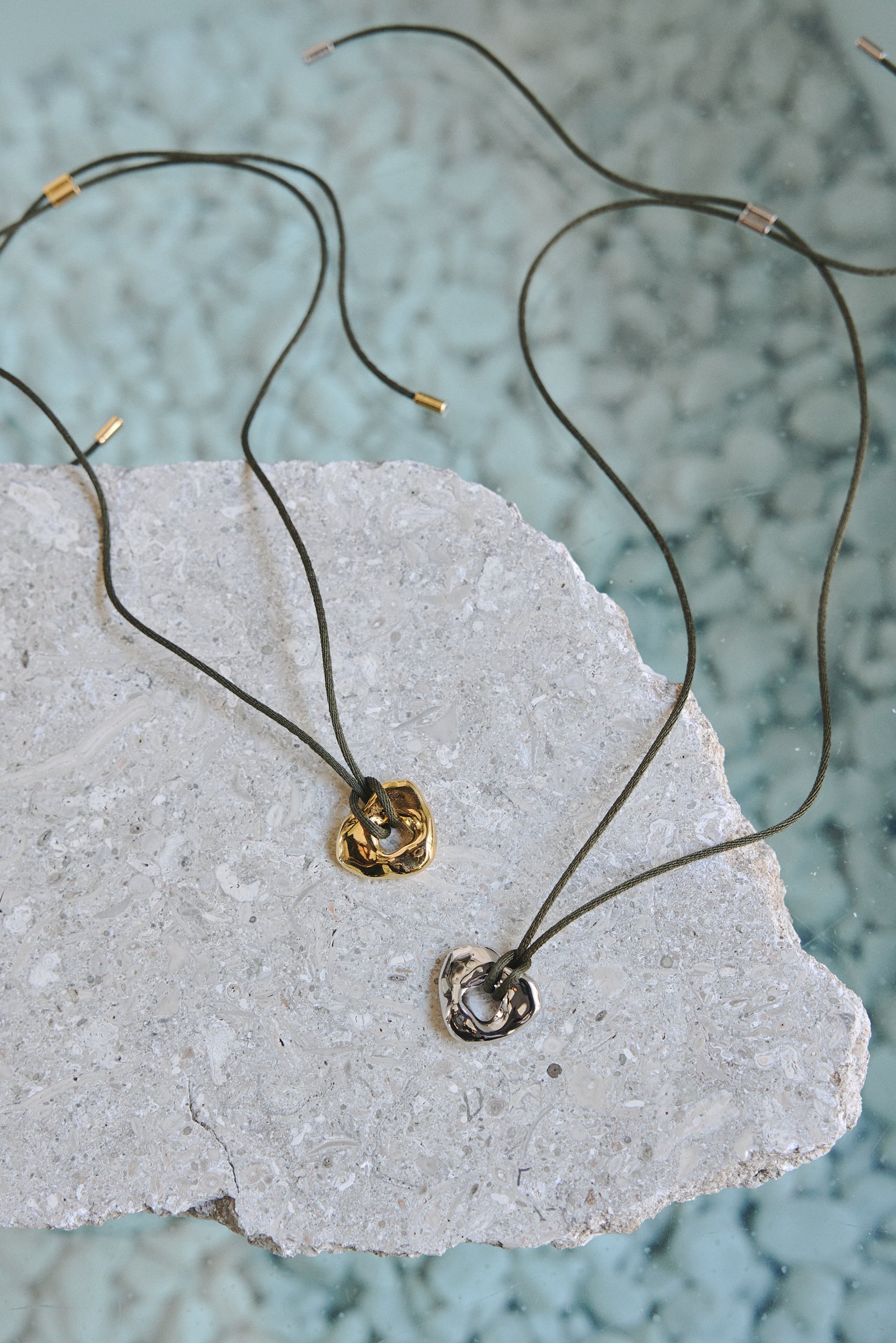 美しいエメラルドグリーンの湖や静かな波、力強い岩のギャップを落とし込んだアイテムを展開。「Verge (necklace)」は削られた岩をモチーフにし、力強くも柔らかい印象に。カーキの紐が秋冬のスタイリングにアクセントをプラスしてくれるネックレスです。既存アイテムとの重ね付けに適した長さで首元を華やかにしてくれます。
