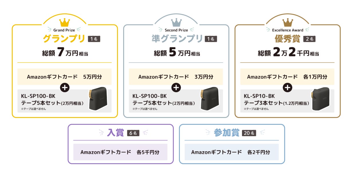 グランプリ(1名):Amazonギフトカード5万円分+KL-SP100-BK・テープ5本セット(2万円相当)