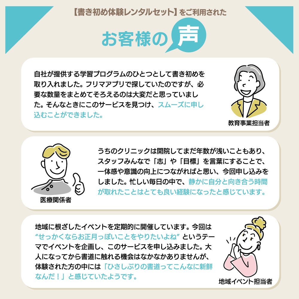 「書き初め体験 レンタルセット」をご利用いただいた皆さまから嬉しいお声がたくさん届いております。