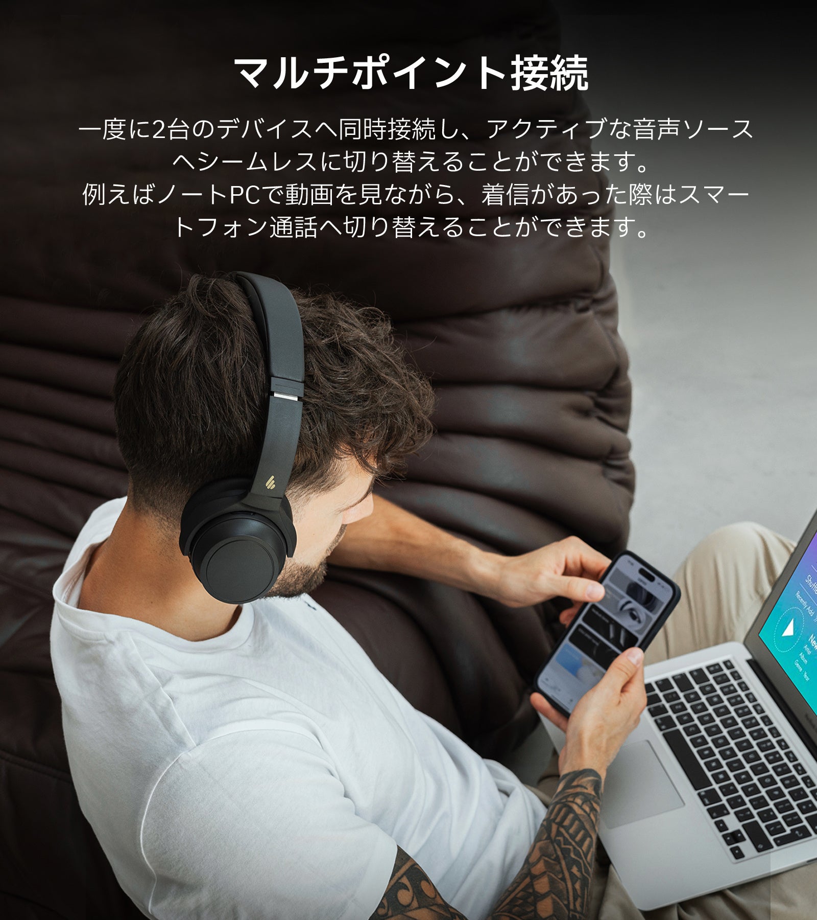 IOS、Android、PCなど、異なるデバイスとのマルチポイント接続が可能。スマートフォンで音楽を楽しみながら、PCでのWEB会議もスムーズに切り替えて楽しむことができます。