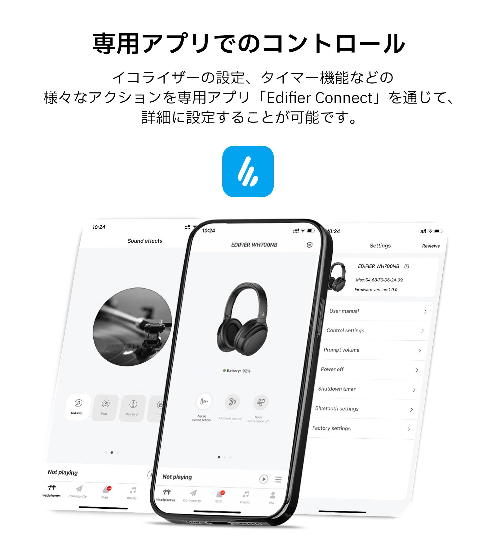 「EDIFIER」専用アプリを通じて、ユーザーの好みに合わせた音質の調整が可能。プリセットイコライザ(クラシック/ポップ/クラシカル/ロック)から選べるので、気分やシチュエーションに応じて最適な音楽体験を実現します。