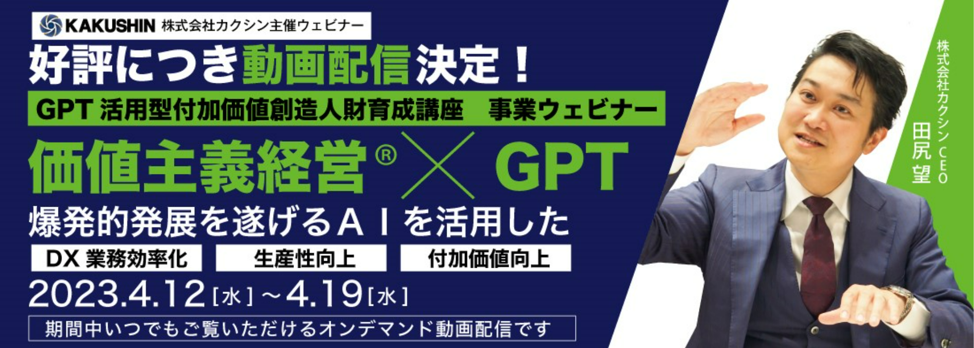 付加価値向上・成果にコミットしたビジネスコンサルティングの株式会社カクシン(⼤阪市、代表取締役 ⽥尻 望)は、GPTを活用し、組織を⾶躍的に⾰新するためのウェビナーを4月12日より配信いたします。
