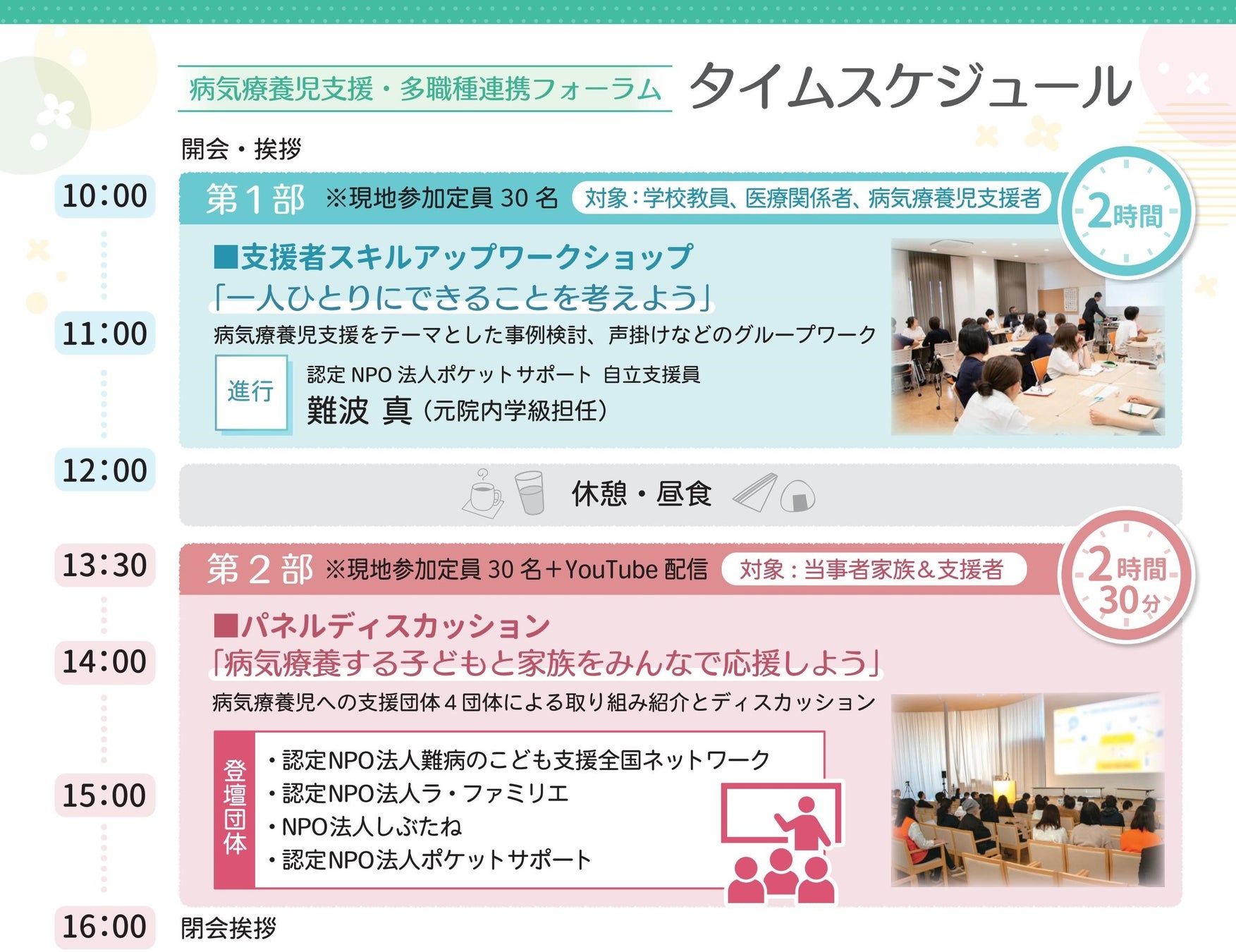 今回の多職種連携フォーラムは、「病気療養する子どもたちの心の声に寄り添う」をテーマとし、教育関係者、医療や行政の関係者、当事者のご家族、特別支援教育を学ぶ大学生、地域支援団体の皆様にもぜひご参加いただきたい内容です。