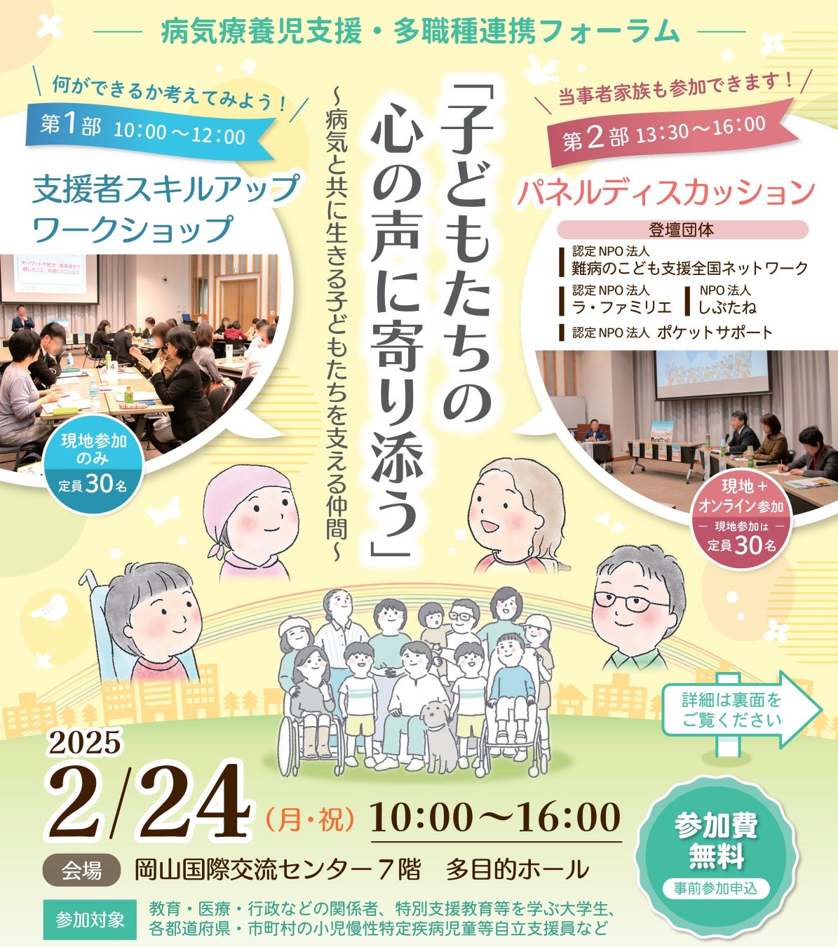 【参加無料】2025年2月24日(月・祝)病気療養児支援・多職種連携フォーラム「子どもたちの心の声に寄り添う~病気と共に生きる子どもたちを支える仲間~」を岡山で現地開催&オンライン配信で開催。