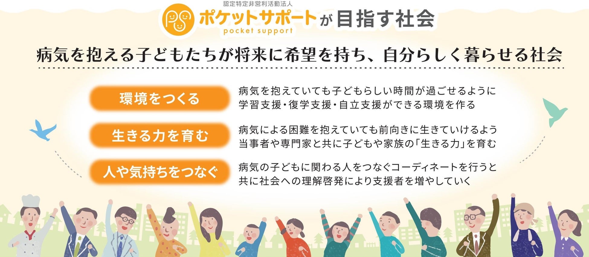 認定NPO法人ポケットサポートは、「病気を抱える子どもたちが将来に希望をもって自分らしく暮らせる社会」をビジョンに掲げ、岡山県岡山市を中心に活動する団体です。