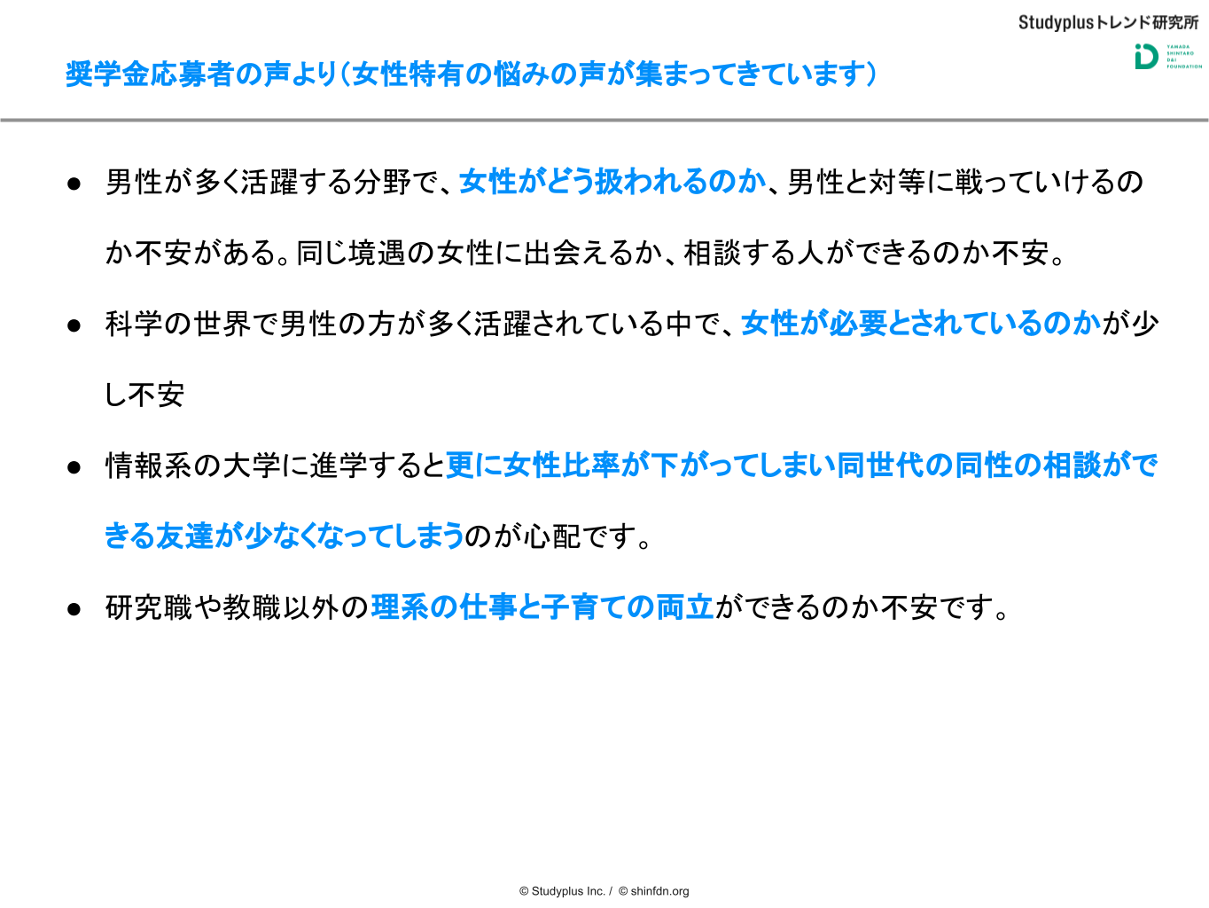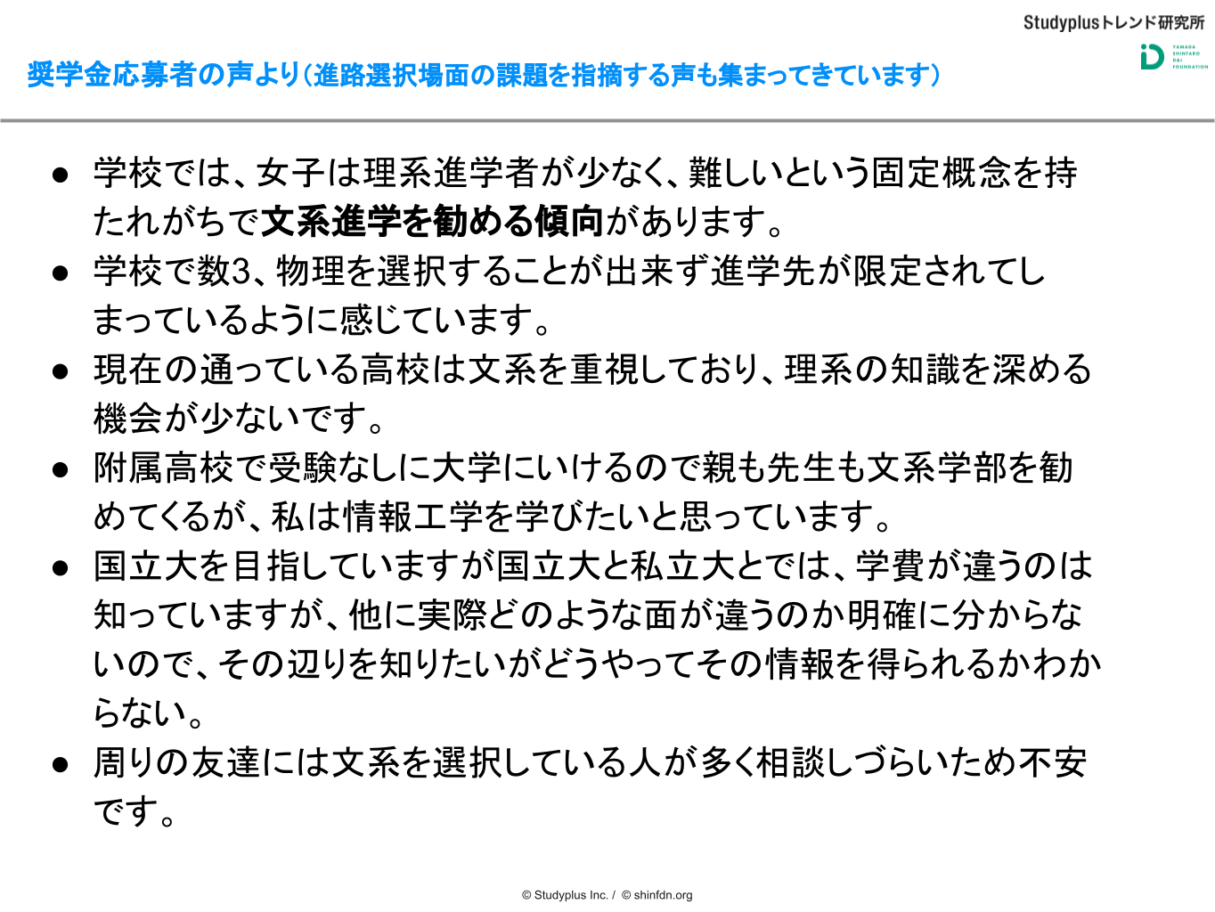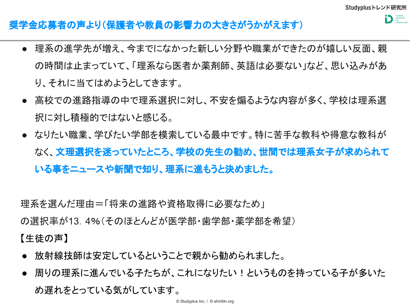 画像の声の3つ目にもありますが、決め手がなくて悩んでいた時に「社会から理系の女性が求められている」という情報があれば、求められているならチャレンジしようという勇気も湧いてくると思います。全国で入試の時点で、STEM分野に進学する女子枠が生まれていることや、私たちの奨学金も後押ししたい気持ちで提供しているので、ぜひ生徒に情報提供いただけると嬉しいです。
