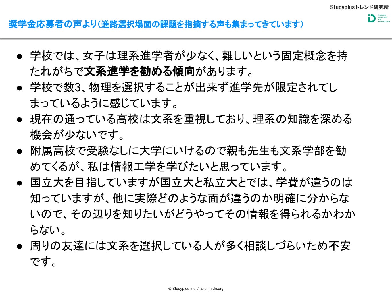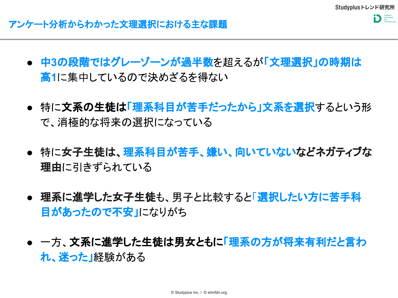 ーーアンケート分析からわかったおもな課題や奨学生の声を踏まえて、文理選択においてどんなサポートを重視すれば良いのでしょうか?