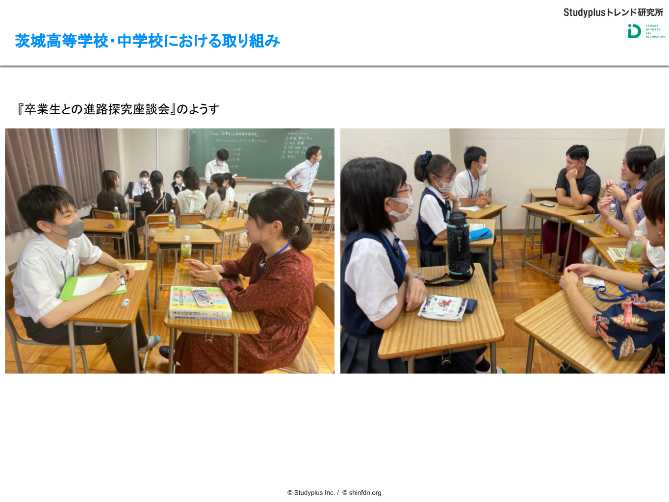 本イベントでは、財団事務局とスタディプラス様に加えて、理系進学する生徒を多数輩出し、キャリア教育に力を入れている茨城高等学校の横倉友博先生にご登壇いただき、アンケート結果を元に進路指導における課題をパネルディスカッション形式で議論しました。