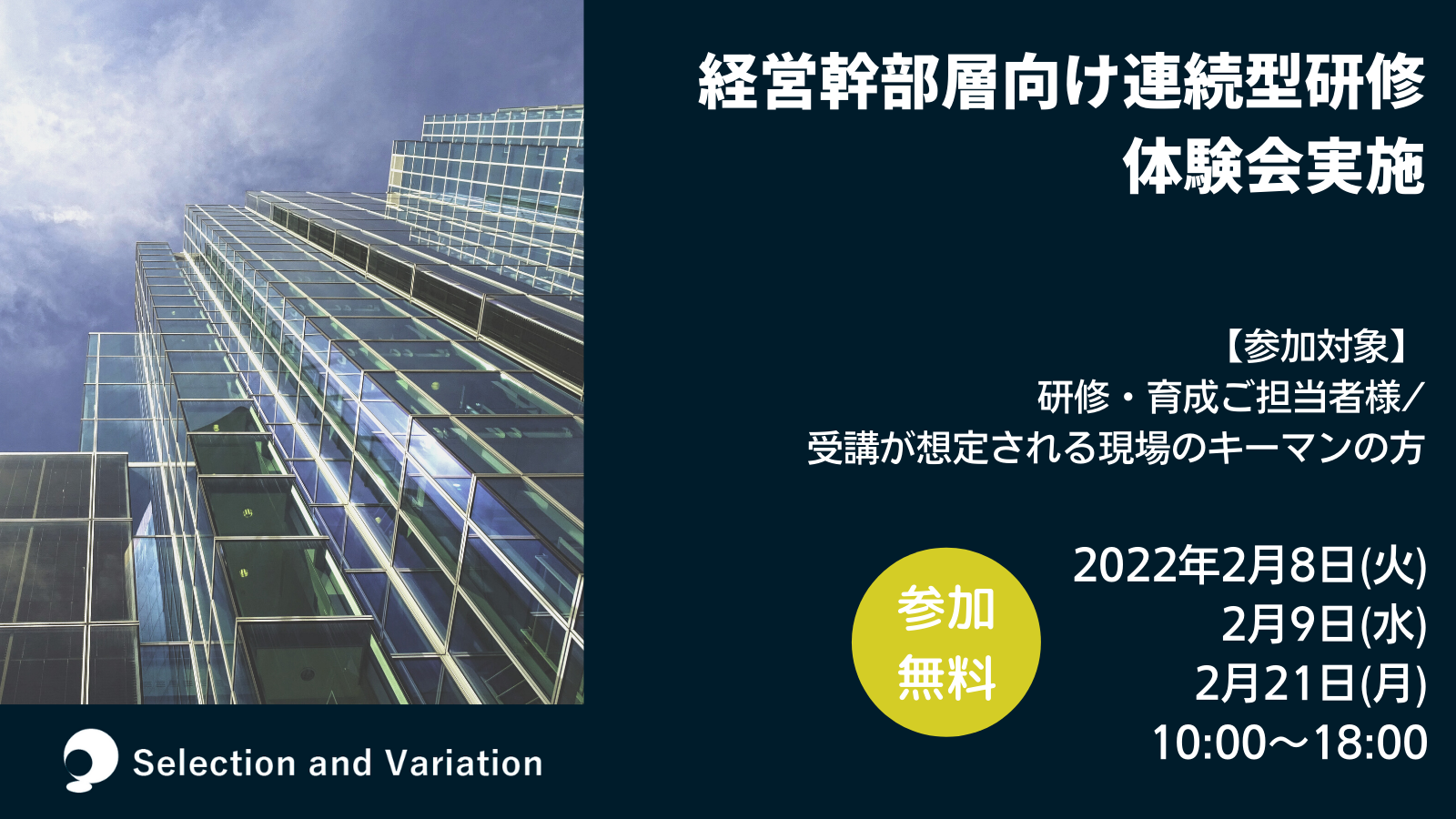 組織・人事コンサルティングファームであるセレクションアンドバリエーション株式会社(以下、当社、東京都港区青山、大阪市西区、名古屋市西区 / 代表取締役社長:平康慶浩/ URL:https://sele-vari.co.jp/)は「経営幹部層向け連続型研修 体験会実施」を2月8日(火)・9日(水)・21日(月)の10:00~18:00に開催することをお知らせいたします。
