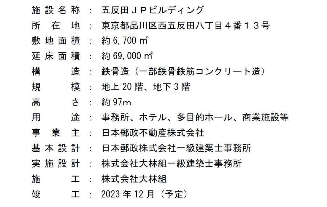 日本郵政不動産株式会社(東京都千代田区、代表取締役社長 山代 裕彦)は、「旧ゆうぽうと」跡地にて開発を進めている大規模複合施設「五反田計画(仮称)」(2023年12月竣工予定)の建物名称を「五反田JPビルディング」に決定したことをお知らせします。