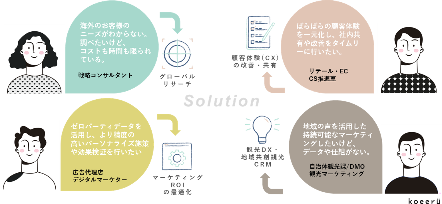 株式会社Koeeruは、「ひとり一人の声で世界をよくする:VOICES for Good」を企業理念に、お客様の声(VOC)を起点とするカスタマーデータプラットフォームKoeeru CDPを開発する鎌倉とハノイに拠点を置くスタートアップです。2021年に設立して以来、グローバルリサーチ、デジタルマーケティング、共創観光CRM、SHEPの分野で、VOCの収集から分析、活用までの課題に対して、独自のソリューションを提供しています。