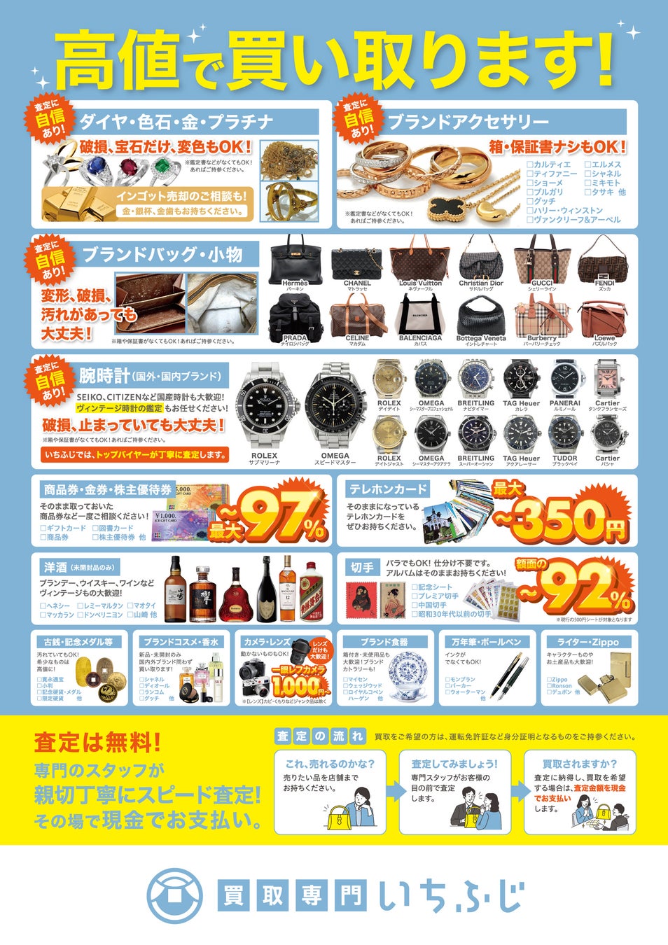 「いちふじ」は「初めてでも安心して利用できる買取店」というコンセプトのもと、清潔感があり、明るく開放的な店舗を提供しています。さらに、ロレックスやシャネル、ヴィトンなどの高級ブランド品や金製品の査定に精通した専門バイヤーが、地域のお客様一人ひとりに丁寧に対応し、迅速かつ適正な価格での査定を行います。