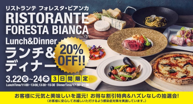 藻岩山の麓のレストラン フォレスタ・ビアンカからの、年に一度のお得な3日間のお知らせ。お客様に元気と美味しいを還元するをテーマに、期間中ランチとディナーのコースが20%OFFでお楽しみいただけるほか、ハズレなしの抽選会にご参加いただけます!2022年3月22日(火)~24日(木)開催