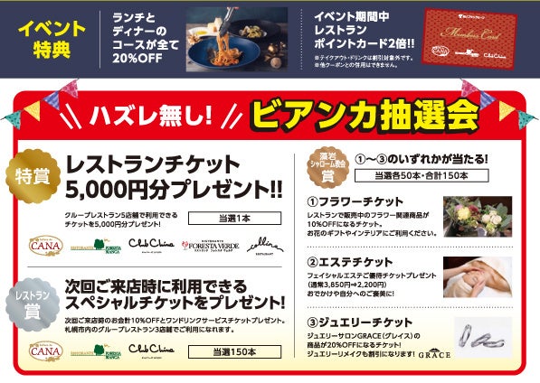 藻岩山の麓のイタリアンレストラン フォレスタ・ビアンカ(北海道札幌市)では、日頃のご愛顧に感謝して「お客様に元気と美味しいを還元!」をテーマにお得な割引特典&ハズレなしの抽選会にご参加いただけるイベントを開催いたします。