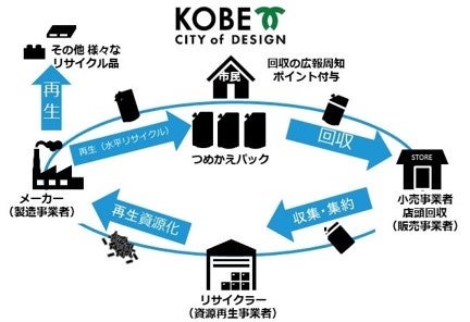 神戸市と小売・日用品メーカー・リサイクラーでつくる神戸プラスチックネクスト つめかえパックリサイクル プロジェクトチームは、「使用済みつめかえパック」が資源として循環されることを目指し、市民からつめかえパックを回収する仕組みづくり、回収品を再びつめかえパックに戻す「水平リサイクル」の検討、再生材利用拡大による市民の循環への実感向上や需要醸成の機会づくりを進めています。2021年10月より活動を開始し、神戸市内の小売75店舗、資源回収ステーション27施設(2025年3月時点)に回収ボックスを設置、3年間で累計約5トンのつめかえパックが集まりました。自治体と製造・販売・回収・再生に関わる複数の企業等が、“競合”の垣根を超えて“協働”で「水平リサイクル」を目指す試みで、神戸から全国への社会実装を目指しています。