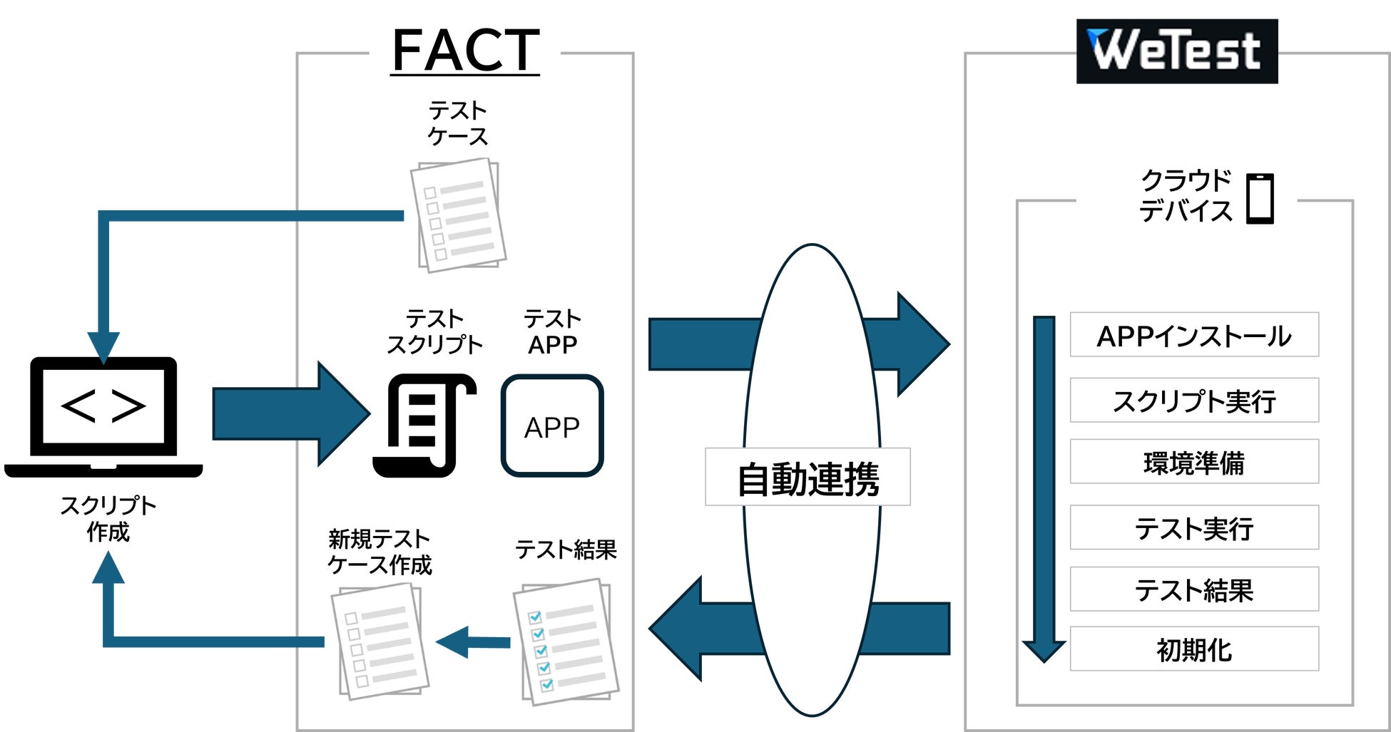 プロジェクト管理ツール『FACT』は、オペレーションを通じて得たナレッジや各種データを活用することで業務標準化を図り、効率化や品質担保といったオペレーションの底上げをはじめ、ビッグデータの解析による新ビジネスの創出や人材育成に繋げていく事を目的としたプラットフォームです。ポールトゥウィンのクライアント様のテスト検証業務を請け負うなかで、より業務標準化ができ、品質担保ができる管理ツールの必要性を感じ、『FACT』の開発を企画しました。また、Tencentのテストプラットフォーム「WeTest」と自動連携し、テストの設計から実行、テスト結果の分析までワンストップで対応することが可能となります。