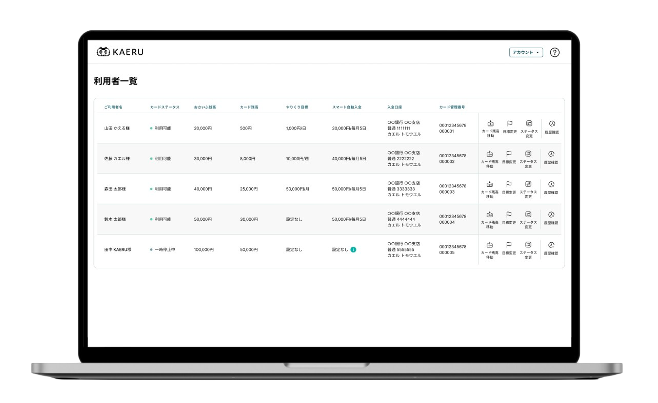 KAERU Biz 権利擁護では、被支援者は国際ペイメントネットワークブランドMastercard®がついたプリペイドカードをお持ちいただき、日常の買いものにご利用いただきます。支援者はそのプリペイドカードへの遠隔チャージ機能や計画的な金銭利用支援機能を用いることで、より効率的に金銭管理支援・自立支援を行うことができます。