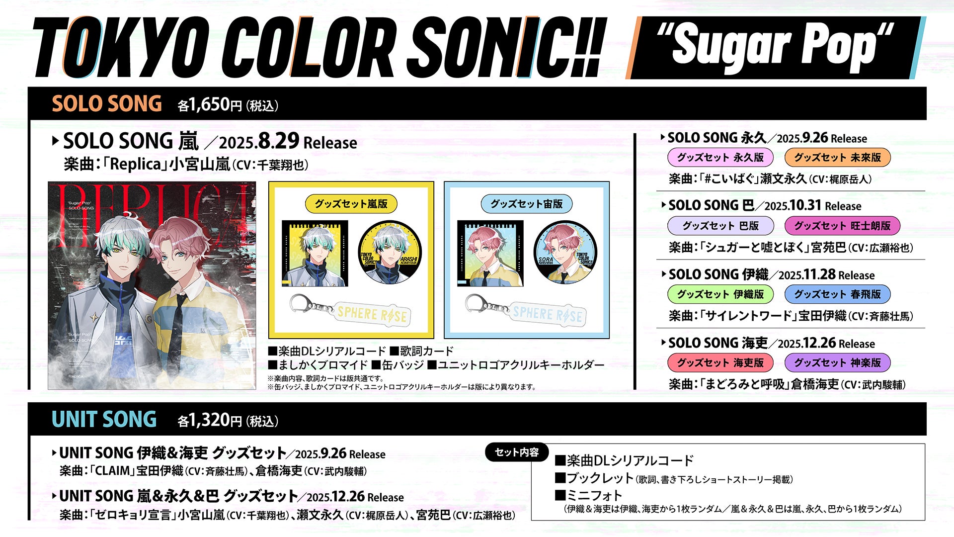 第1弾「東京カラーソニック!! "Sugar Pop" SOLO SONG 嵐 グッズセット嵐版/宙版」は8月29日(金)発売予定。