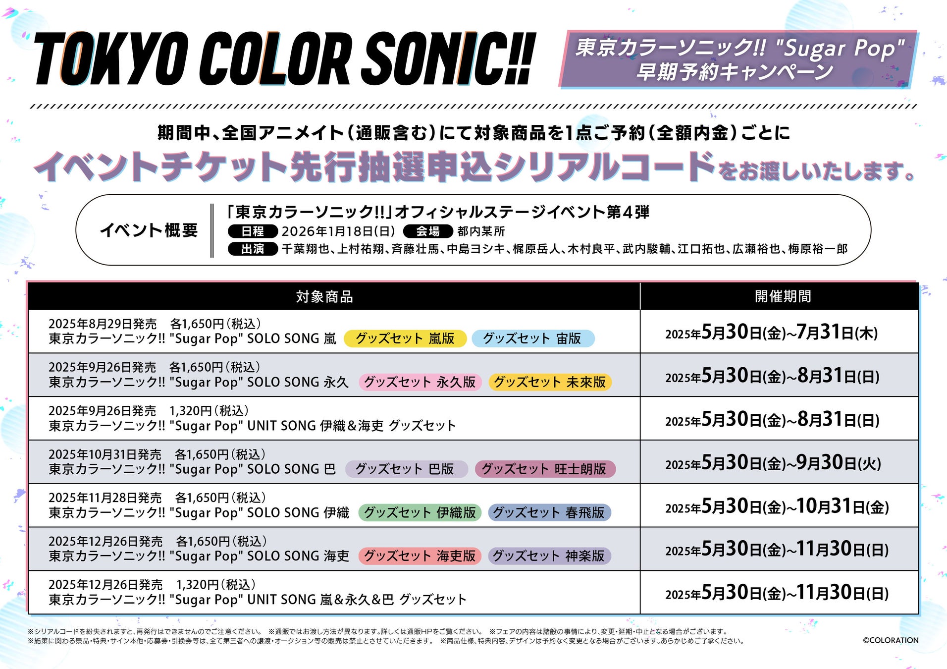 さらにアニメイト早期予約特典には2026年1月18日(日)開催となる「東京カラーソニック!! Special Live -Sugar Pop-(ソニライ4th)」の「イベントチケット先行抽選申込シリアルコード」をお渡しします。