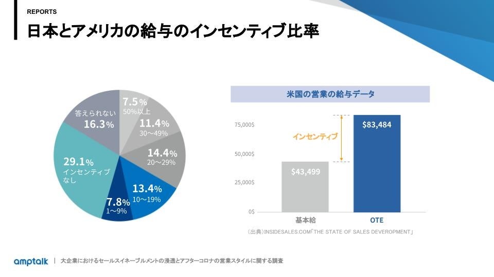 セールスイネーブルメントの一部であるインセンティブに関しては、「インセンティブがなし」が29.2%であり、インセンティブ比率19%以下が過半数を占める状態であり、成果主義が根強いアメリカでは基本給とインセンティブの比率が6:4に対して、大きく差があることがわかりました。