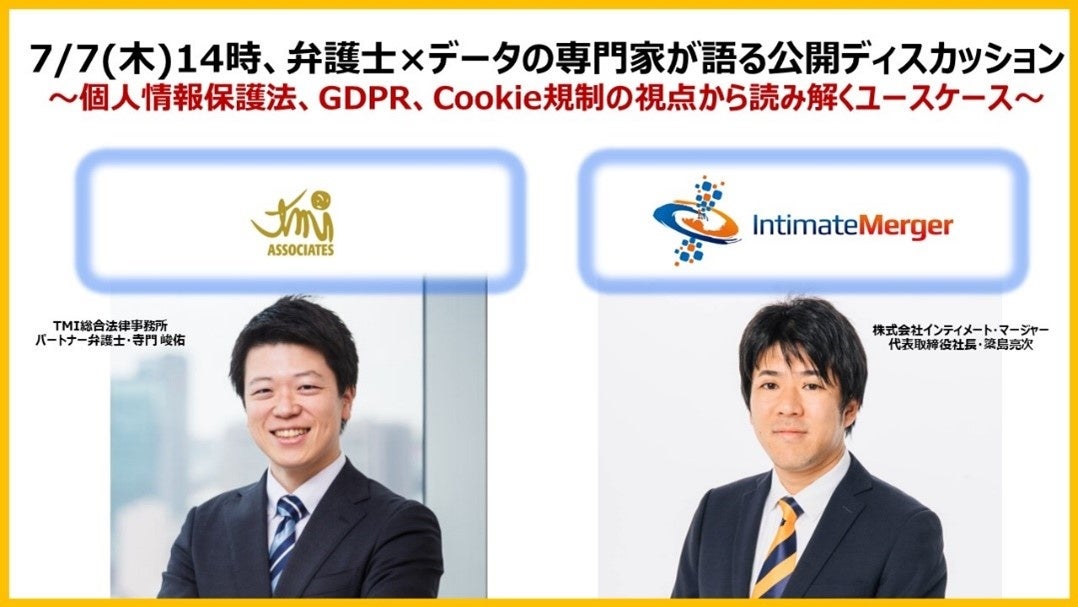 国内最大級パブリックDMPを提供するデータプラットフォームカンパニーの株式会社インティメート・マージャー(本社:東京都港区、代表取締役社長:簗島 亮次、以下当社)は、データ・プライバシー領域における法律と現場の双方に精通した国内有数の専門家であるTMI総合法律事務所の寺門峻佑弁護士と無料オンラインセミナー「弁護士×データの専門家が語る公開ディスカッション~個人情報保護法、GDPR、Cookie規制の視点から読み解くユースケース~」を7月7日(木)14時より共催することをお知らせします。