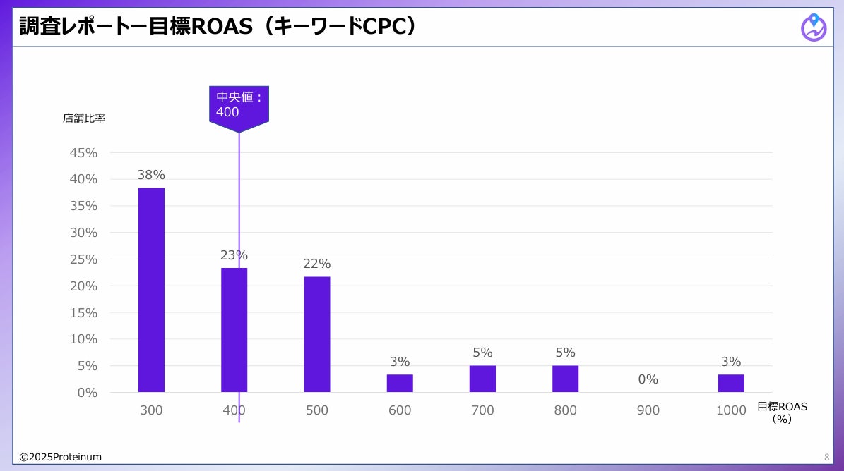 レポート内では、RPP広告運用の実態を示す様々な指標について、中央値や店舗の分布をグラフで示しています。資料の一部として、主要な指標の中央値をご紹介します。