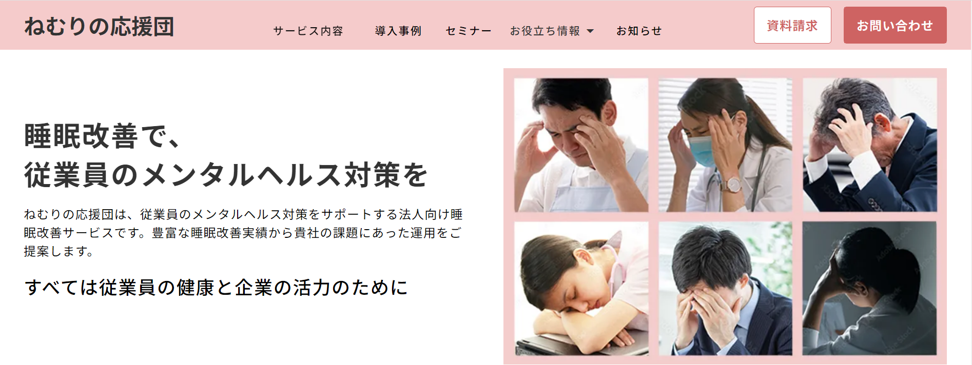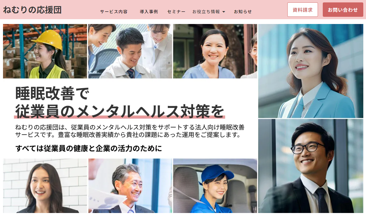 今回のサイトリニューアルでは、従業員への睡眠改善を行うことが企業の健康経営・メンタルヘルス対策に直結することを分かりやすくお伝えするため、ブログやお役立ち資料、セミナーのアーカイブ配信などのコンテンツ提供を追加し、全面リニューアルいたしました。これまで培ったノウハウや経験をもとに、企業の課題解決に全力で寄り添います。