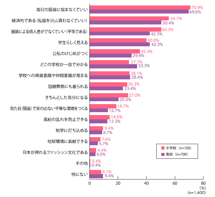 ・学校制服の良い点(TOP3)…「毎日の服装に悩まなくていい」(中学校70.9%、高校69.6%)、「経済的である(私服を沢山買わなくていい)」(中学校55.7%、高校50.4%)、「服装による個人差がでなくていい(平等である)」(中学校50.3%、高校42.3%)