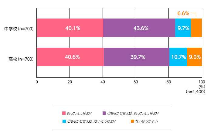 学校制服の必要性は、中学校は「あったほうがよい」(40.1%)と「どちらかと言えば、あったほうがよい」(43.6%)をあわせると、83.7%が学校制服は必要だと回答しています。また、高校においても「あったほうがよい」(40.6%)と「どちらかと言えば、あったほうがよい」(39.7%)をあわせると、80.3%が学校制服は必要だと回答しています。