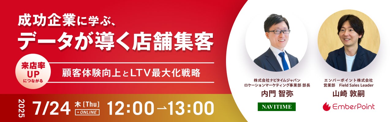 セミカスタム型モバイルアプリパッケージ「App Publisher」を提供するエンバーポイント株式会社(本社:東京都千代田区、代表取締役:五十嵐 真人、以下エンバーポイント)は、2025年7月24日(木)12時00分より、株式会社ナビタイムジャパンのロケーションマーケティング事業部と無料ウェビナー『成功企業に学ぶ、データが導く店舗集客~来店率UPにつながる顧客体験向上とLTV最大化戦略~』を開催いたしますのでお知らせいたします。