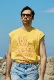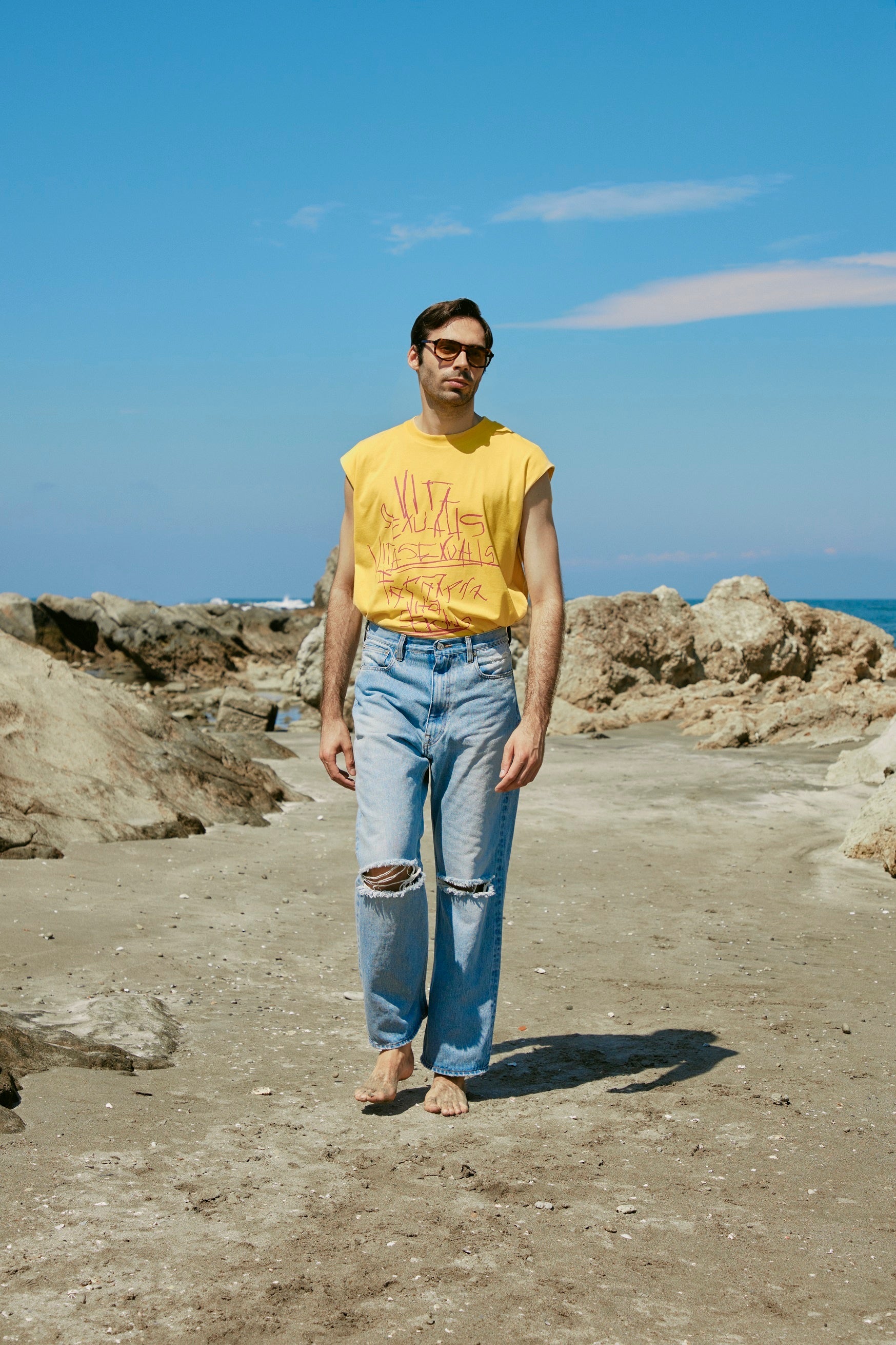 手書き風グラフィックプリントのノースリーブTシャツ。