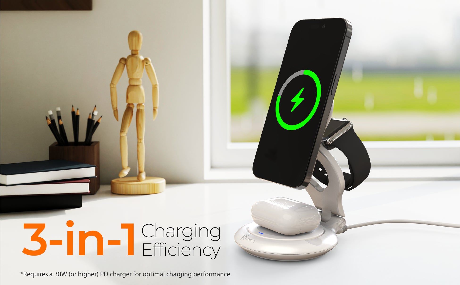 JUPW3415は、最先端のQi2テクノロジーを採用し、MagSafe対応のiPhoneに最大15Wのワイヤレス充電を提供します。3in1設計で、スマートフォン、スマートウォッチ、イヤホンを同時に充電可能です。高い自由度を誇るスタンド式デザインで、磁気固定により縦向きでも横向きでも設置でき、縦向きでメッセージを確認したり、横向きで動画を視聴したりすることが可能です。さらに、台座には270度の回転機構が搭載されており、お好みの方向に自由に調整できます。使用しない時は折りたたんでバッグに収納でき、持ち運びにも便利です。※ACアダプターは付属していませんので、別途でPD30W以上の充電器をご用意いただく必要があります。