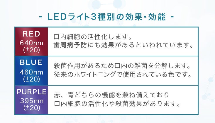 3色のLEDライトが照射可能なため、ホワイトニング以外での効果も見込める。