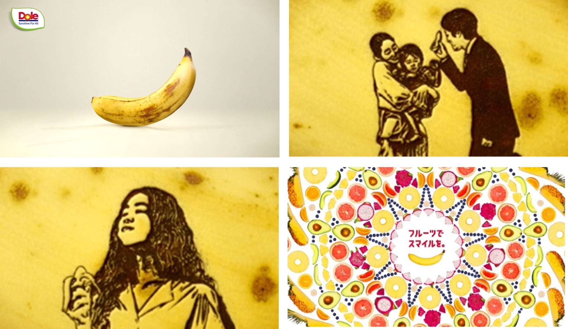 新ブランドメッセージに込められた想いを多くの方へ伝えるため、ドールの主力商品であるバナナのシュガースポットを活用したブランドムービーを制作。バナナの表面をキャンバスにし、子供から大人まで様々な生活シーンにドールのフルーツが寄り添う様子を表現しました。最後には、海外の生産者の人々の姿も描き、消費者から生産者までをフルーツの力で暮らしを支えていることを表しています。
