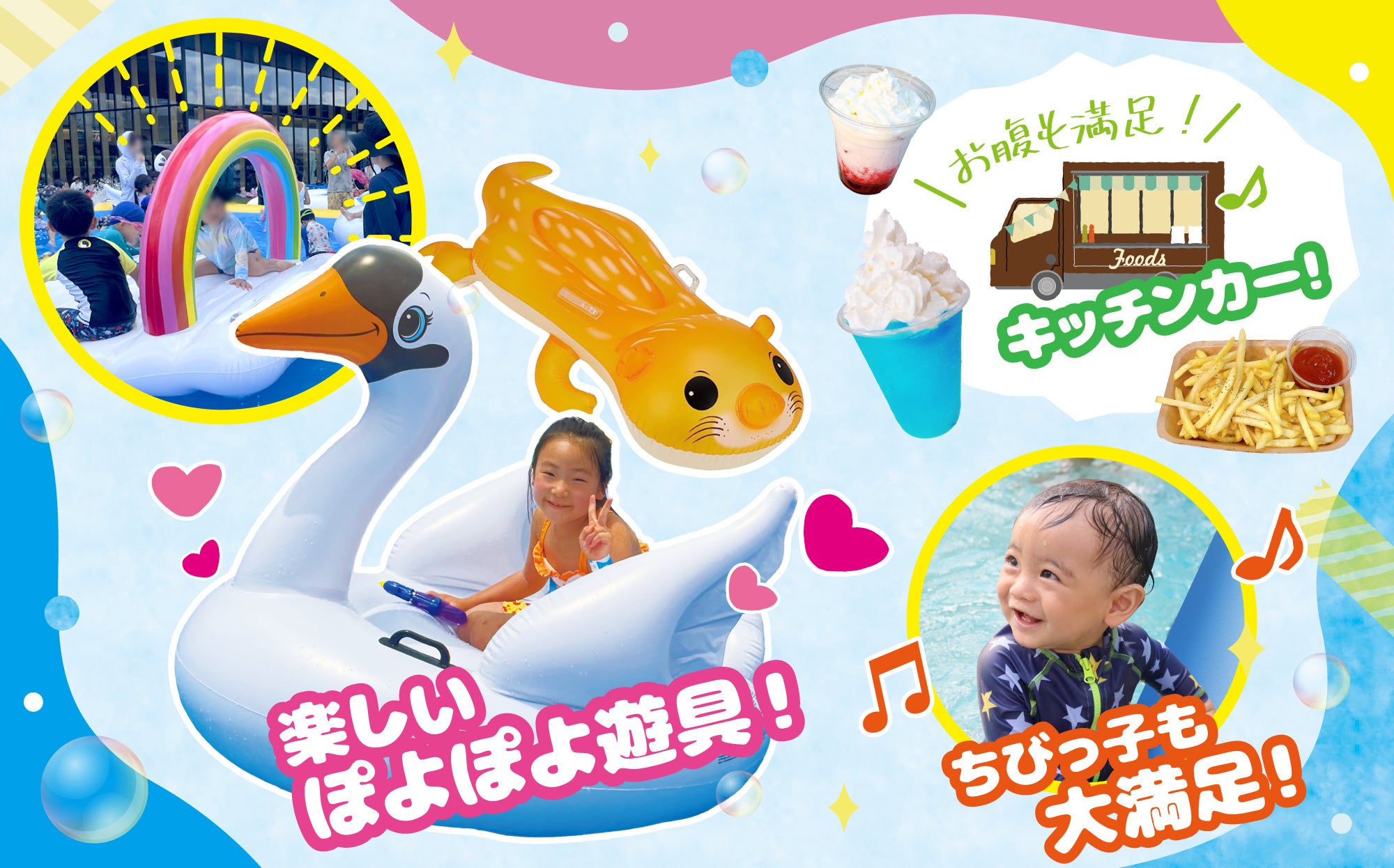今年は楽しさボリュームアップ!巨大ドームプールやちびっこスライダーなどの新アトラクションが登場! プールデビュー前の乳幼児からわんぱくキッズまで大満足の水遊びイベントです。