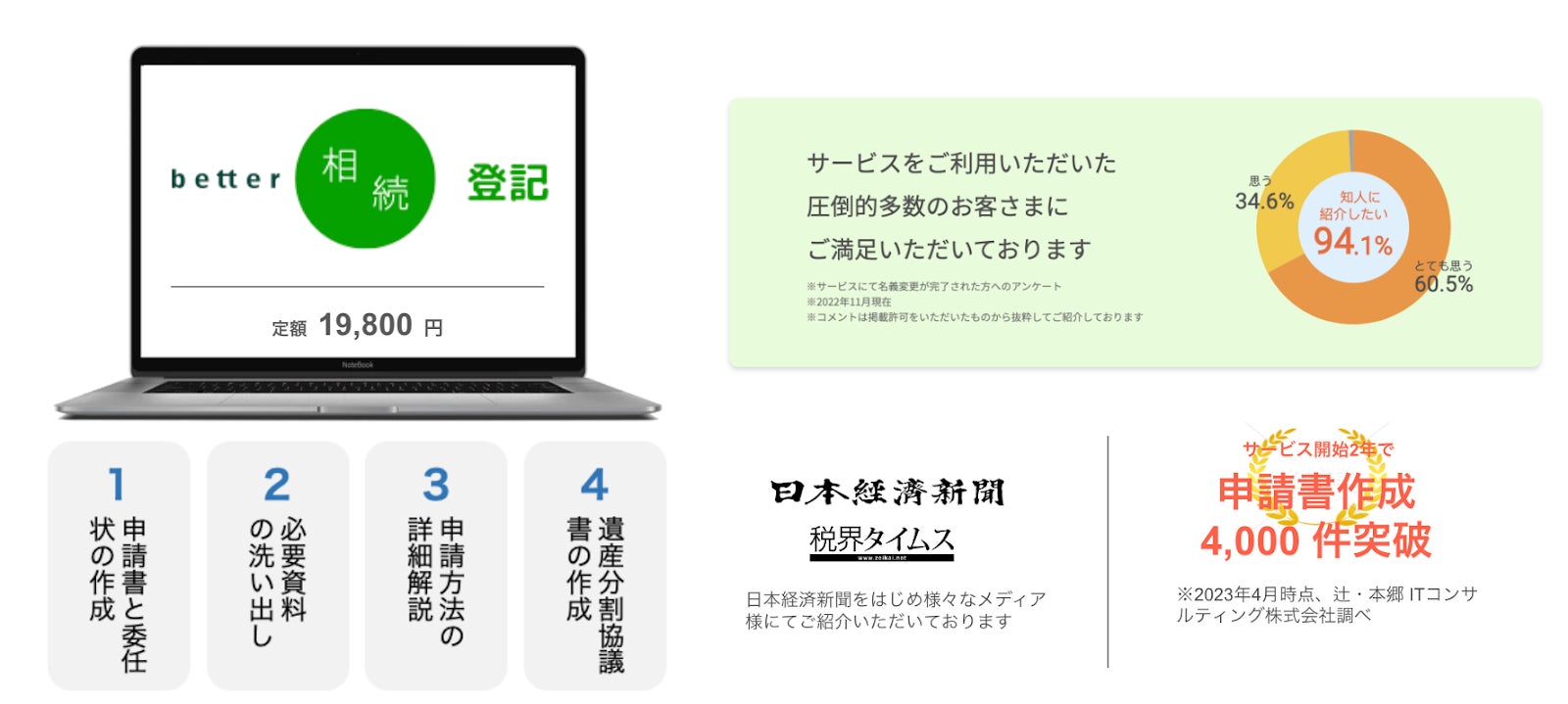 2015年の相続税法改正により、相続税申告の対象者が大幅に増加し、できるだけ税理士報酬を抑えて自分で相続税申告を行いたい方が増えました。このような背景から、2020年に「自分でできる相続税申告 better相続申告(https://jp-better.com/lp/shinkoku/)」を提供開始しました。また、2021年には、「自分でできる相続登記 better相続登記(https://jp-better.com/lp/touki/)」を提供開始しています。2024年4月には、相続登記の義務化が予定され、相続登記を必要とする方が大幅に増える見込みです。better相続の利用者の平均年齢は54歳で、相続手続きが発生する世代の方に幅広くご利用いただいています。