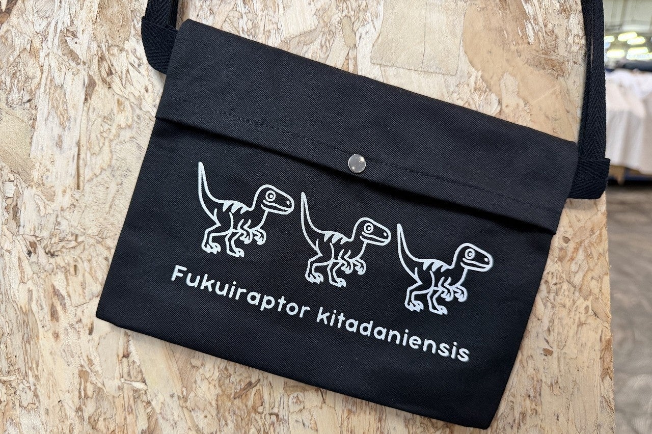「繊維のまち勝山」の産地に残った材料(=残反[ざんたん])を利活用し、参加者ご自身でオリジナルサコッシュを製作いただきます。デザインは、勝山市で発掘された肉食恐竜「フクイラプトル」などをモチーフとしており、好きな色を選んでシルクスクリーンで生地に印刷します。ミシン操作がありますが、工場スタッフによる丁寧な解説・サポートのもとで、縫製経験が無い方でも安心して本格的なものづくりを体験いただけます。