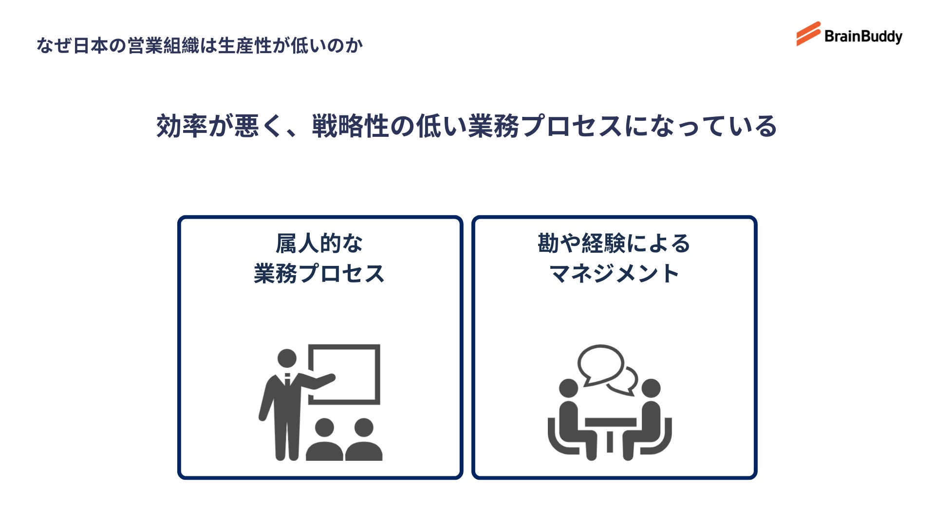 現代の営業組織が直面する主要な課題は、従来の個人のスキルや経験に依存する業務プロセスや管理方法に起因しています。これらの課題が解決されない限り、営業活動は効率的で戦略的なものにはなりにくく、結果的に生産性が低下する可能性が高まります。