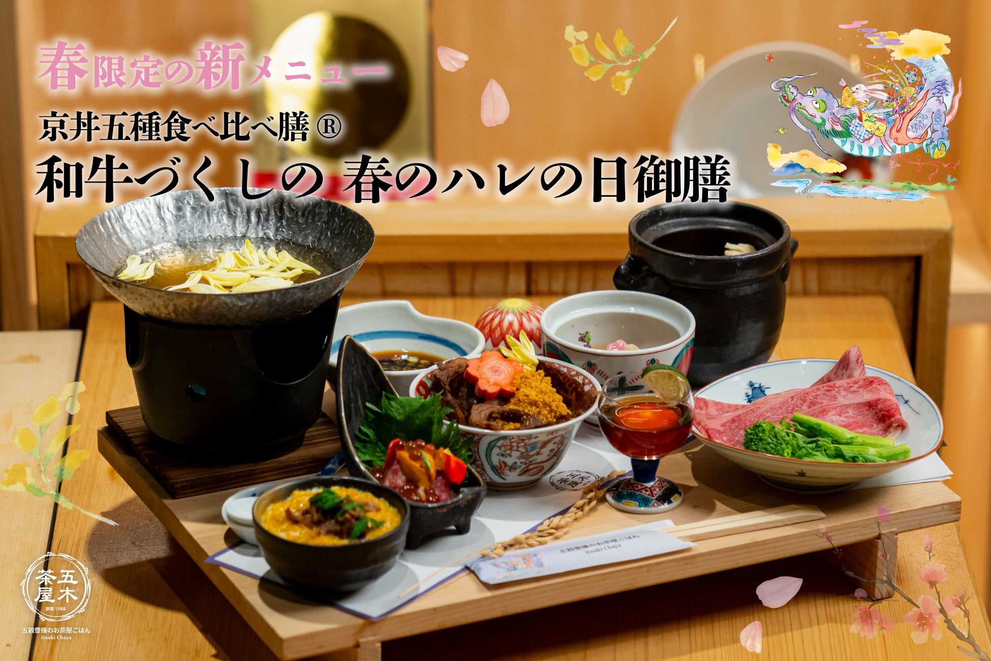 「春の息吹を感じる季節となりました。五木茶屋®︎ 先斗町店から、春の喜びをお届けする京丼五種食べ比べ膳をご用意いたしました。厳選された旬の食材を使用し、丁寧に調理した春の食材と和牛の組み合わせを、趣ある空間で存分にお楽しみください。ご来店を心よりお待ちしております。」
