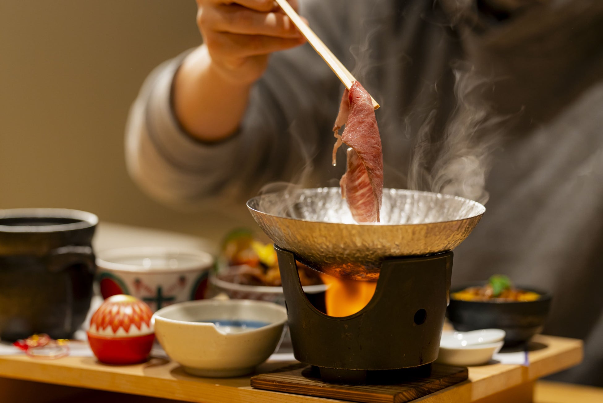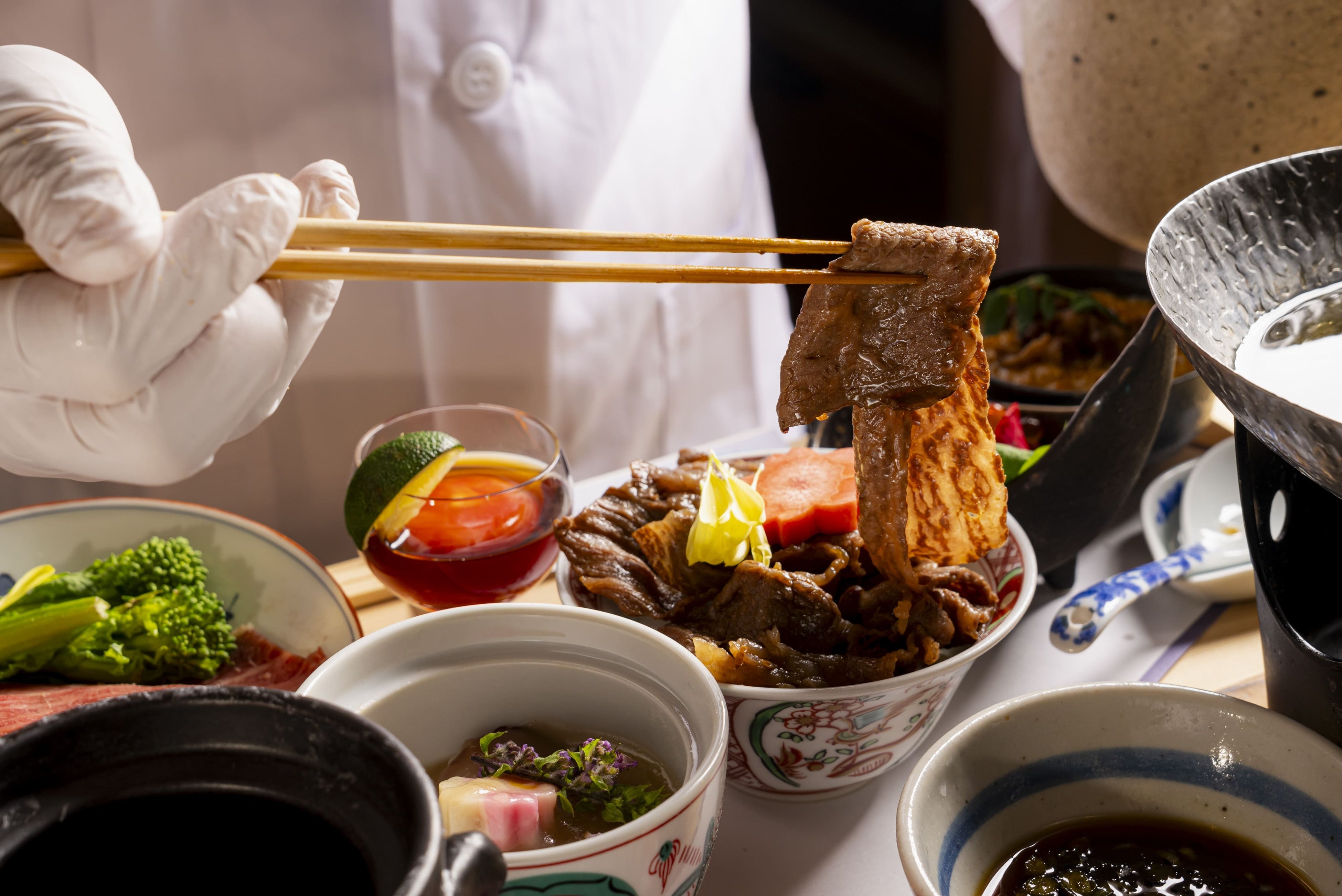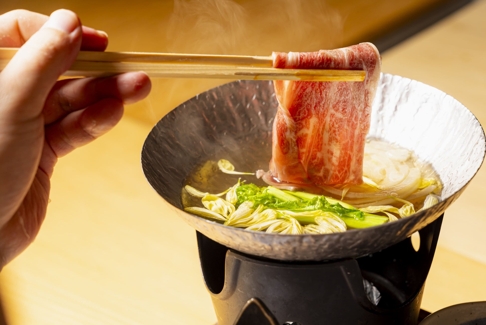 「和牛肩ロースのすき焼き」は甘辛い特製のタレをくぐらせる重厚感のある逸品です。厳選された和牛と旬の食材を、ご自身のペースで味わう至福のひとときをお過ごしください。