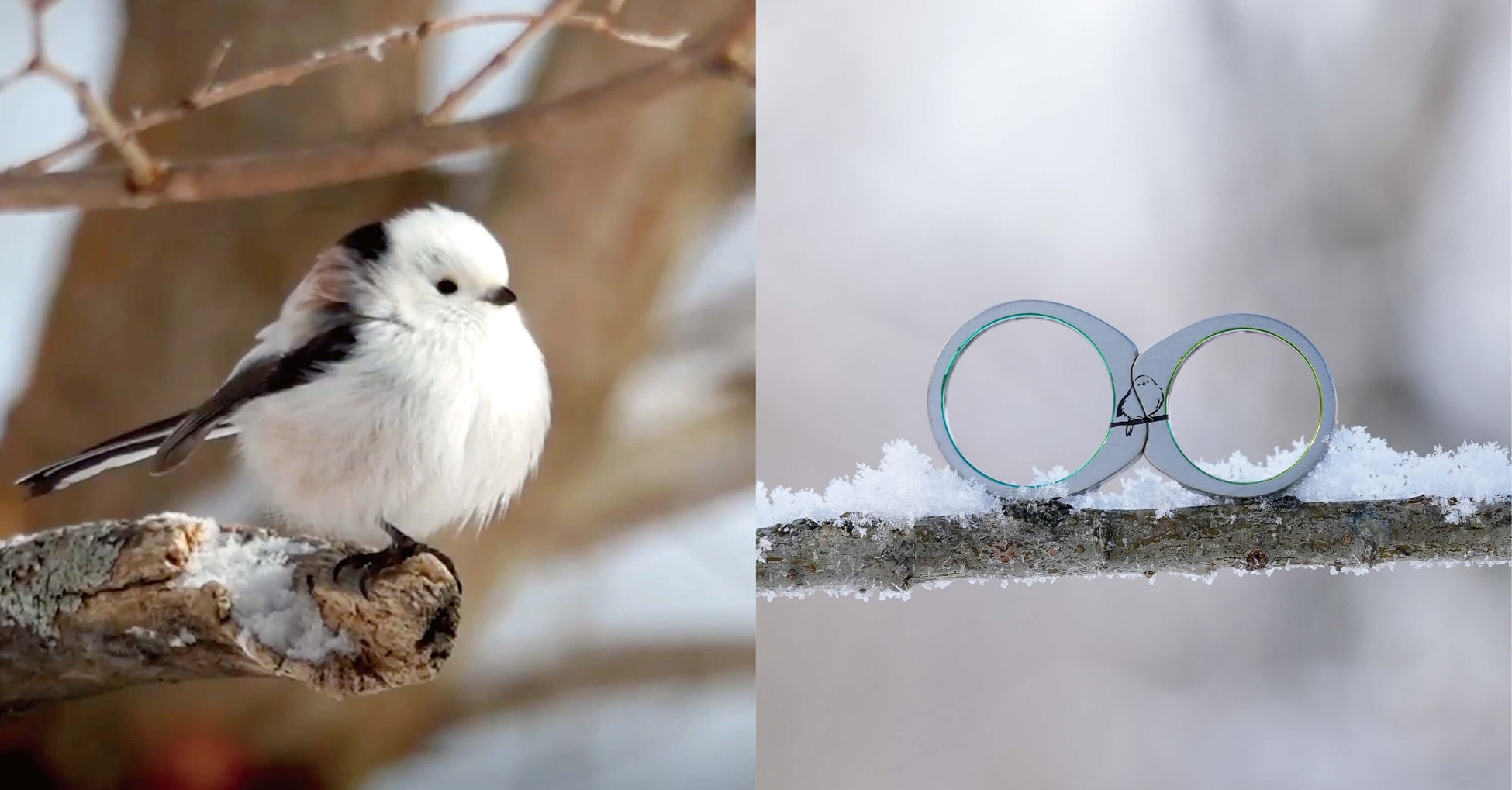 ふっくらと雪のようなシマエナガが、こちらを見つめる結婚指輪は、「GEAR(ギア)」というSORAオリジナルの融合デザインがベースになっています。ぴったりと触れ合うふたつの指輪に、一目でわかるその愛くるしいシマエナガの姿が緻密に再現されます。