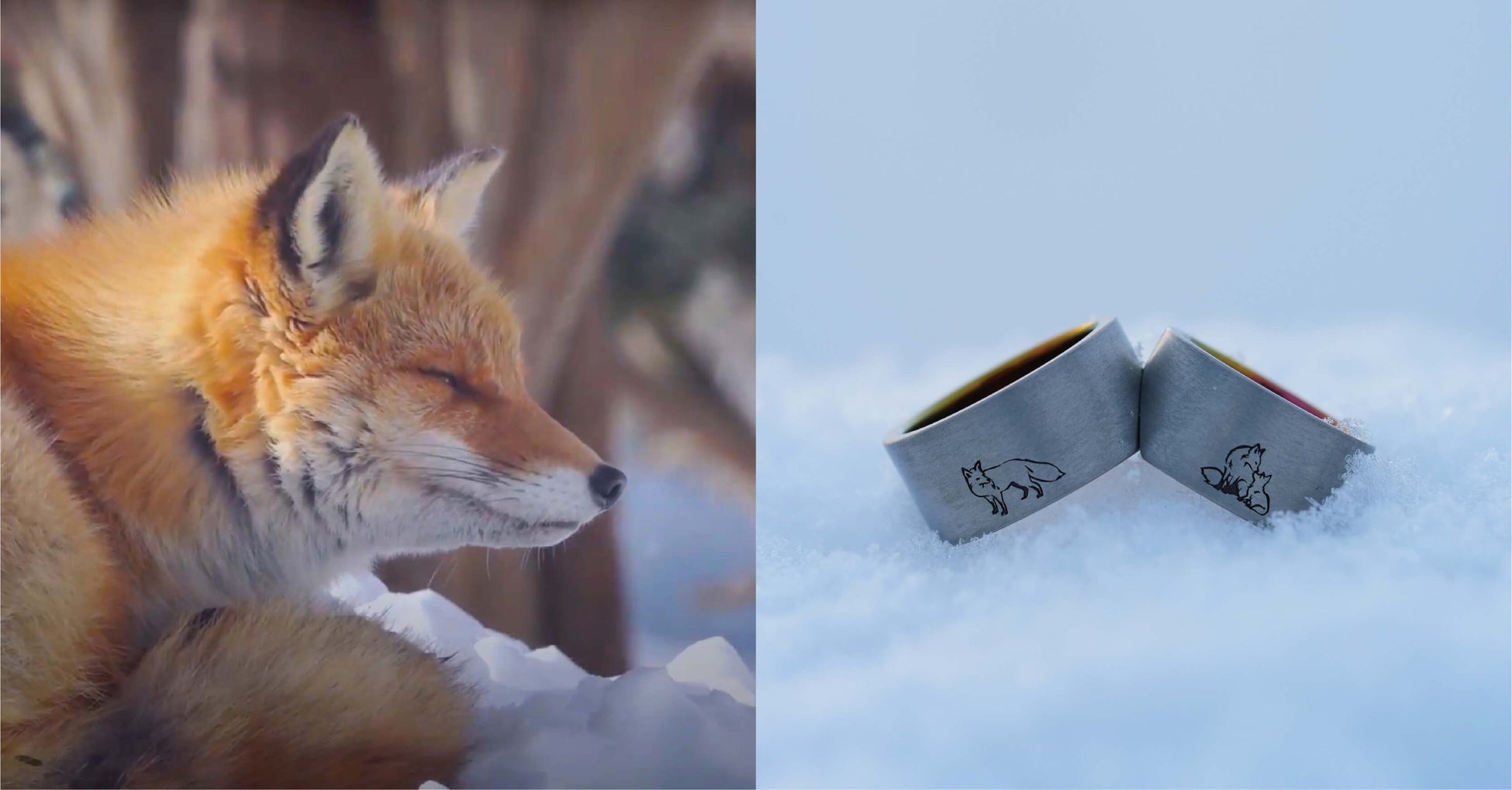 キタキツネの子育ての様子を「KNOT(ノット)」というSORAオリジナルの融合デザインの指輪に刻みました。片方には仲睦まじい親子を、もう一方には母ギツネを振り返る子キツネの巣立ちの様子を描いています。