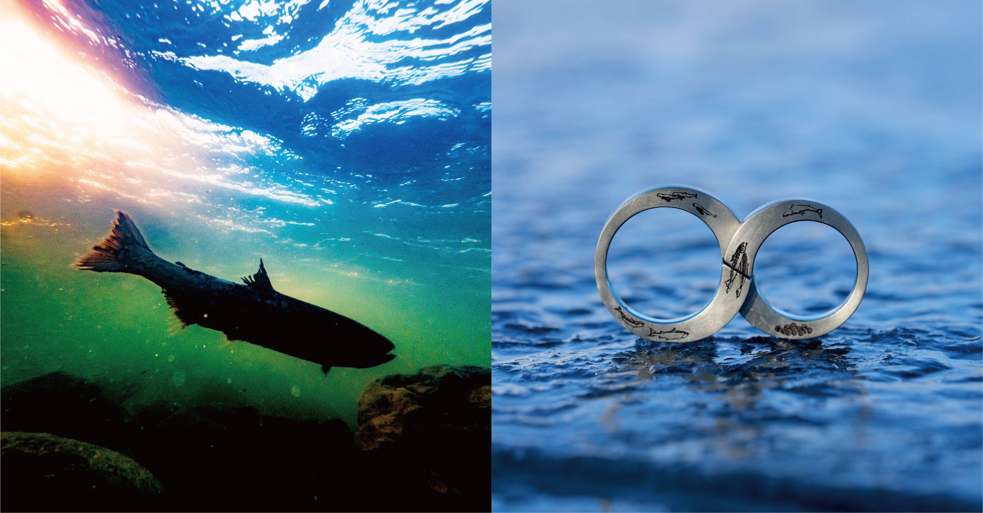 サケの生涯を「LEMNISCATE(レムニスケート)」という無限軌道を描く融合デザインに描きました。川から海、そしてまた川に戻り大地へと数多の命を繋げる地球を舞台にしたサケの壮大な旅を表現しています。